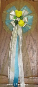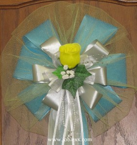 These Beautiful custom-crafted Silver/turquoise flora-satin (waterproof) pew bows will add elegant touch to your special day like wedding, parties. Also, can be used for decorating chairs, doorways, arches, church pews, doors etc... Each bow is 9" across and is made with loops of silver/turquoise flora satin ribbon and yellow tulle, 22" total in length. The center of the bow features rosebuds, satin edge ribbon, ivy, spray and romantic beads with 2 silver rings. Sure to please! We hold true to the integrity of our promise and take Great pride in our work.