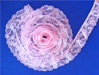 It's 2 inch wide ruffled floral lace trim sold in 5 yard lots. Purchase as many lots as you need or like – additional lots will not be cut unless requested.