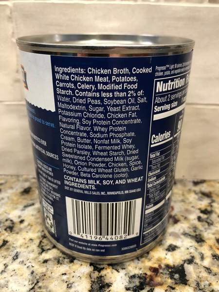 Ingredients: Chicken Broth, Cooked White Chicken Meat, Potatoes, Carrots, Celery, Modified Food Starch. Contains Less than 2% of: Water, Soybean Oil, Peas*, Salt, Sugar, Maltodextrin, Yeast Extract, Potassium Chloride, Chicken Fat, Soy Protein Concentrate, Butter, Flavoring, Sodium Phosphate, Whey Protein Concentrate, Natural Flavor, Cream, Nonfat Milk*, Yeast Extract, Soy Protein Isolate, Fermented Whey, Parsley*, Wheat Starch, Sweetened Condensed Milk (Sugar, Milk)*, Onion Powder, Garlic Powder, Chicken*, Spice, Honey, Cultured Wheat Gluten, Citric Acid, Beta Carotene (Color).*Dried.