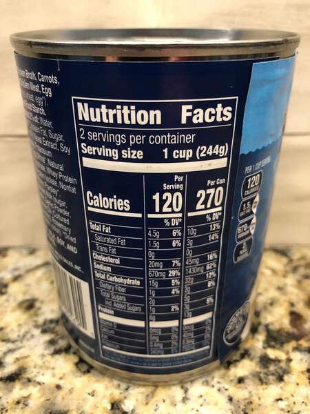 Ingredients: Chicken Broth, Carrots, Cooked White Chicken Meat, Egg Noodles (Semolina Wheat, Egg*), Celery, Modified Food Starch, Contains Less than 2% of: Water, Soybean Oil, Salt, Chicken Fat, Sugar, Cream, Maltodextrin, Yeast Extract, Soy Protein Concentrate, Potassium Chloride, Butter, Egg White*, Natural Flavor, Sodium Phosphate, Whey Protein Concentrate, Soy Protein Isolate, Nonfat Milk*, Fermented Whey, Parsley*, Sweetened Condensed Milk (Sugar, Milk)*, Onion Powder, Garlic Powder, Chicken, Spice, Butter Oil, Cultured Wheat Gluten, Flavoring, Rosemary Extract, Beta Carotene (Color).*Dried.