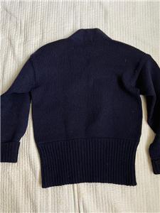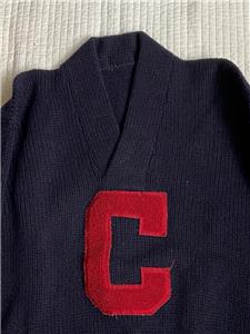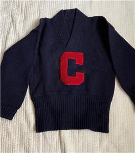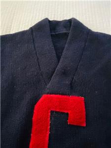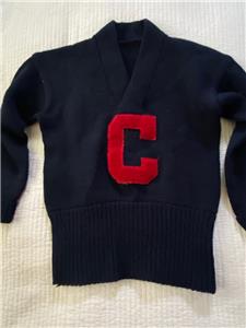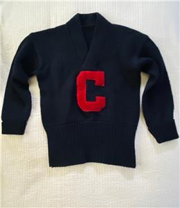 Vintage 1920’s-30’s rare navy blue wool pullover wool sweater with a burgundy letter C on it. (The letter looks more red in pics but is burgundy) Very nice shawl collar, ribbed cuffed sleeves and ribbed waist. Really perfect thick wool for fall and winter.