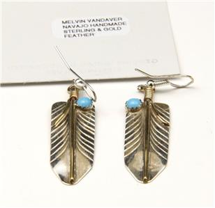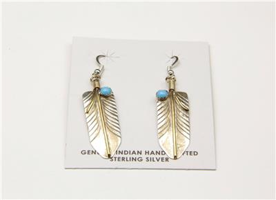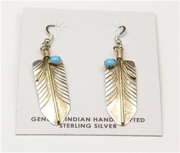 -Beautiful Sterling silver and Gold filled "feather" dangle earrings with a small round bezel set turquoise stone
