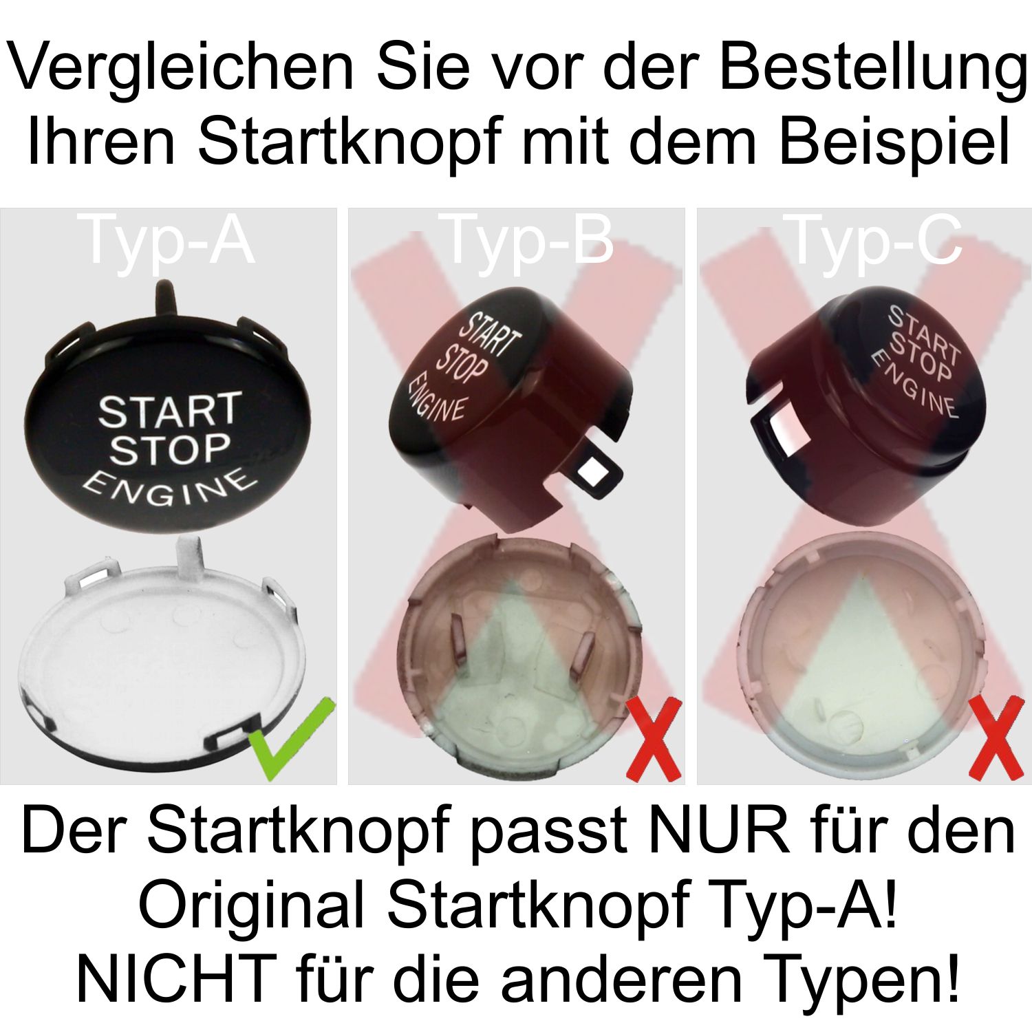 Die Fahrzeugverwendungsliste gibt keine 100% Garantie. Nur wenn unsere Fotos mit Ihren Start/Stop Knopf übereinstimmen, passt die Kappe auch.