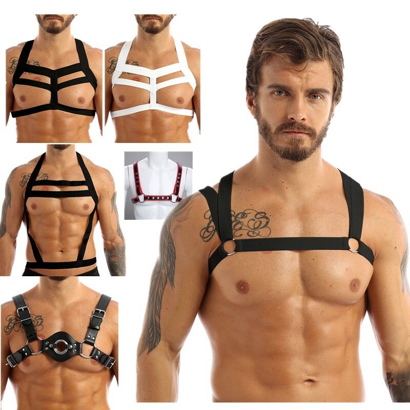 - Mens PU Leather Adjustable Body Chest Harness Belt, One size fits most.