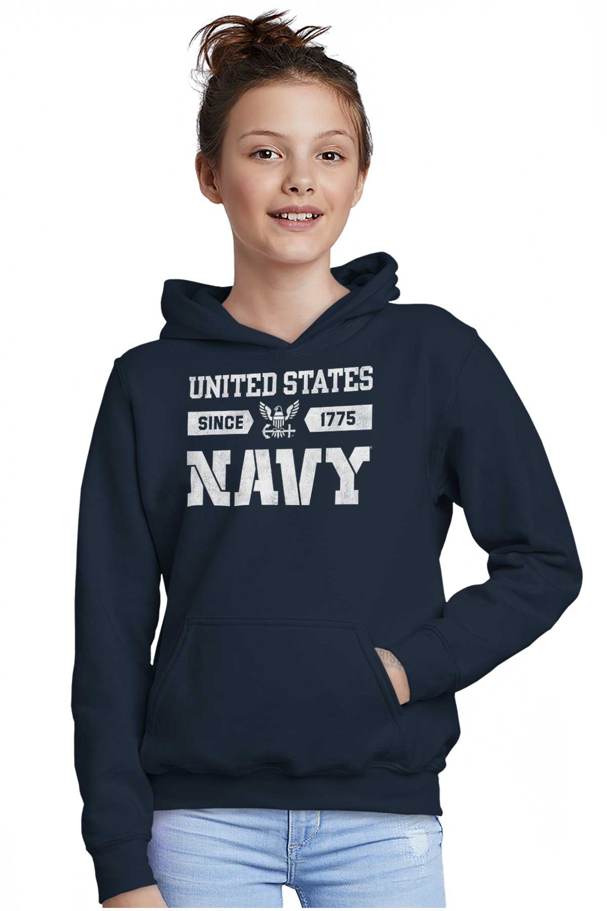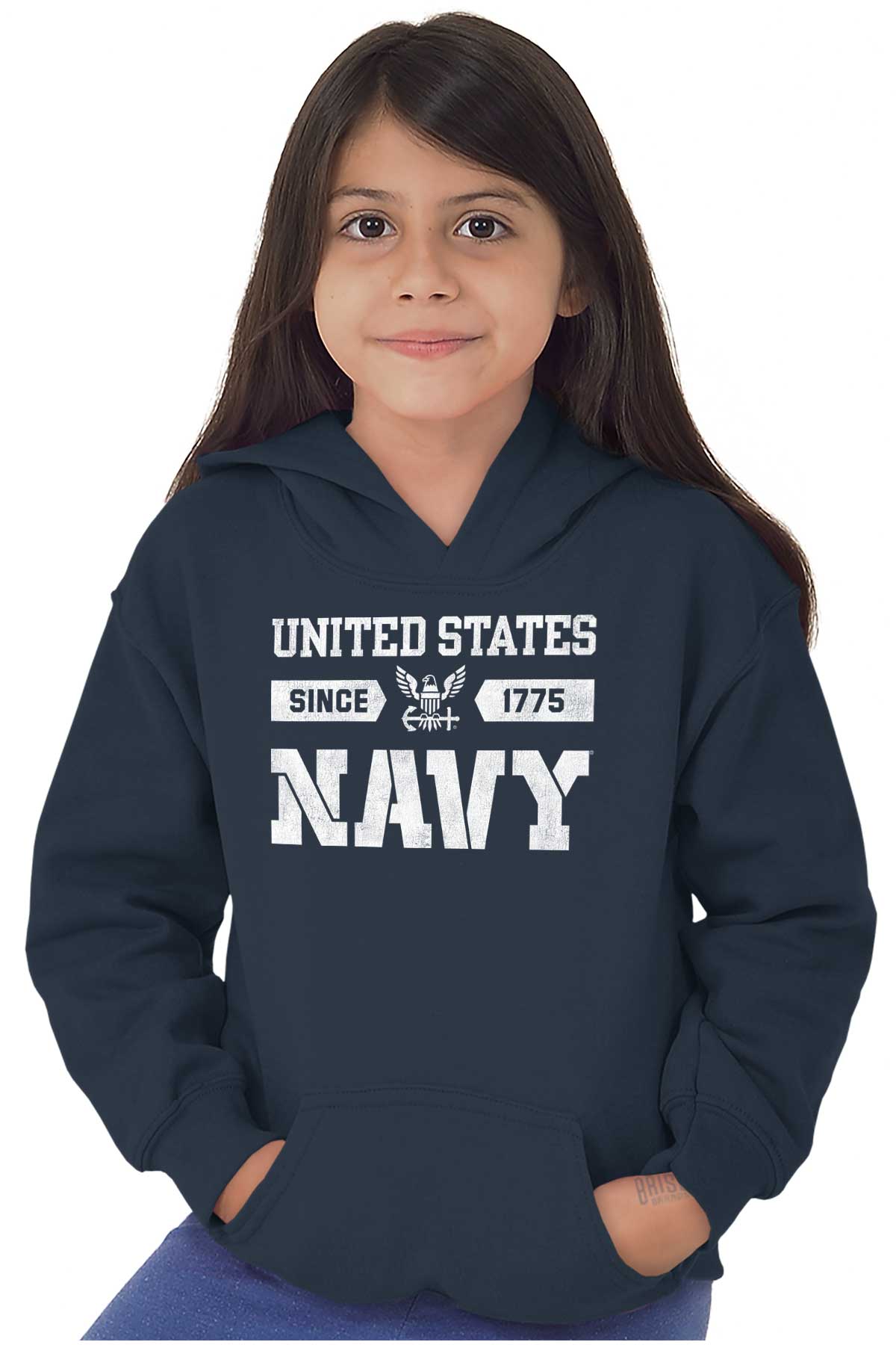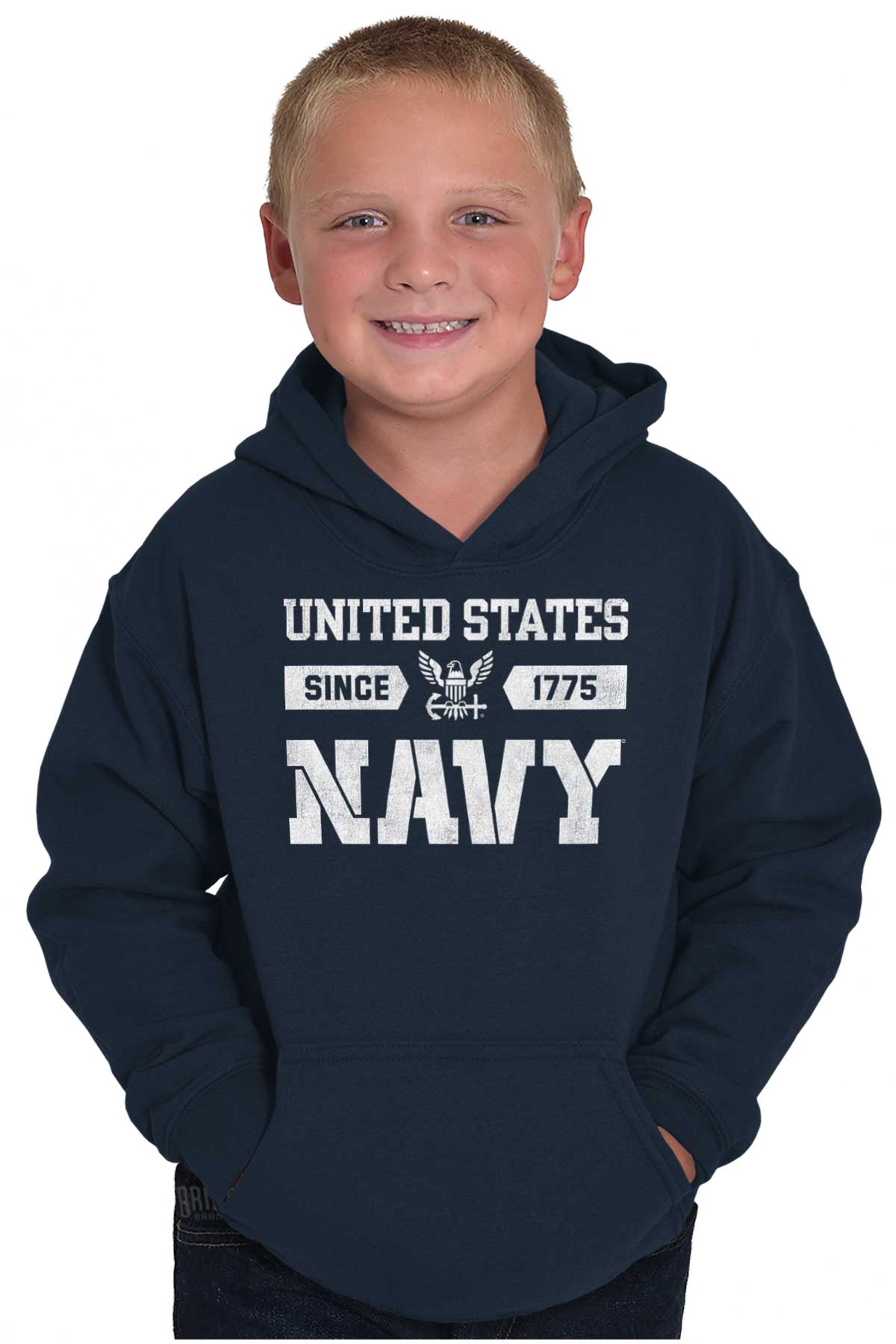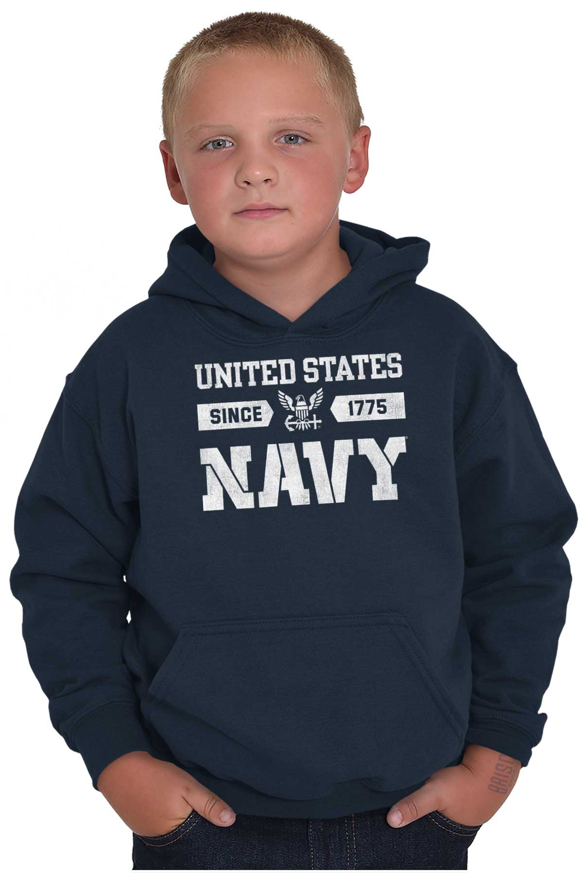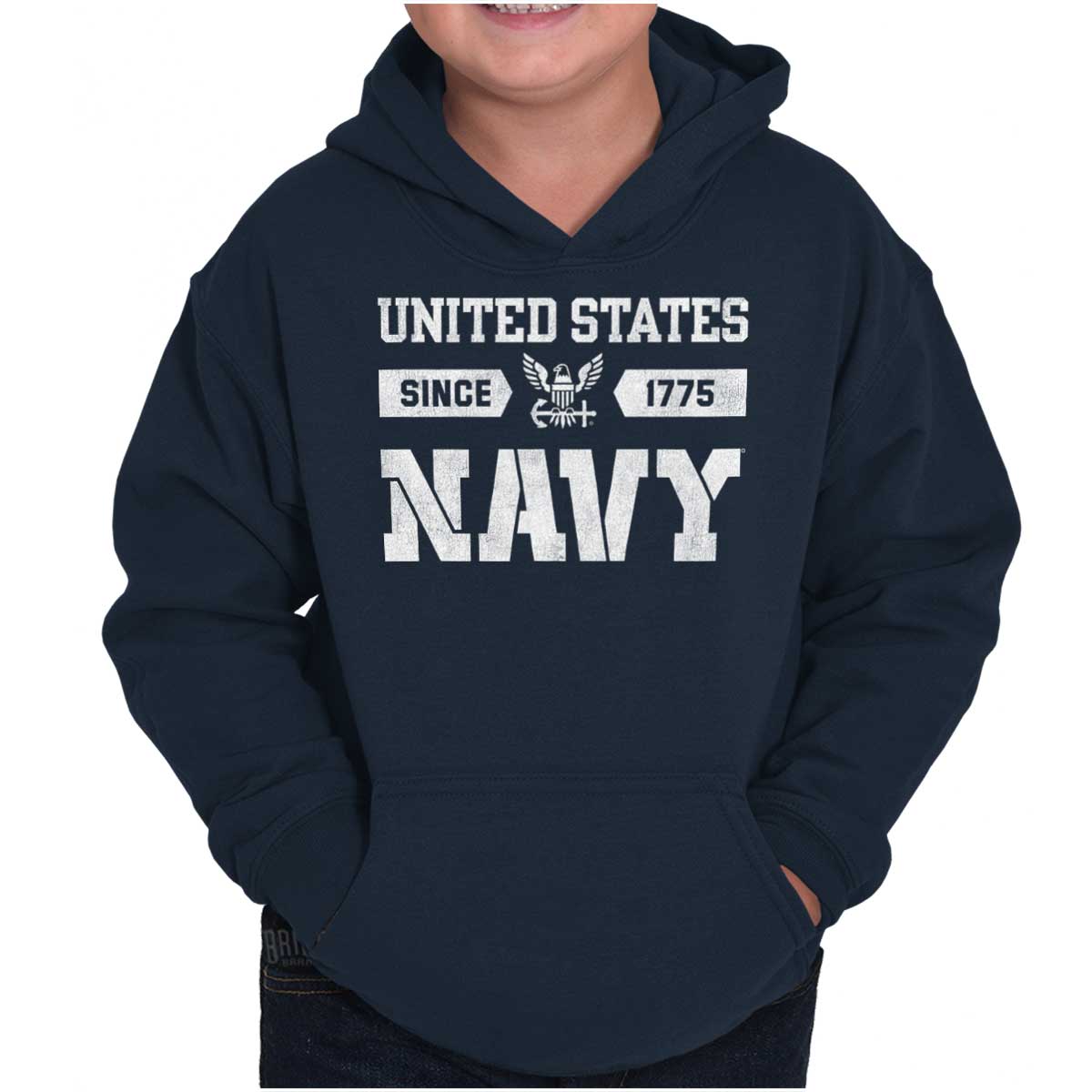 For our past, present and future Navy sailors, this Youth Hoodie is a representation of your military service, a display of your dedication and virtue. For your family members and loved ones, may they wear your colors and logo with pride and patriotism. The bald eagle icon is a symbol of your strength and power. The anchor commemorates the USS CHIEF and signifies your leadership. A clean and simple style to recognize the powerful maritime service branch of the US Armed Forces. We salute our naval forces and the United States Military.