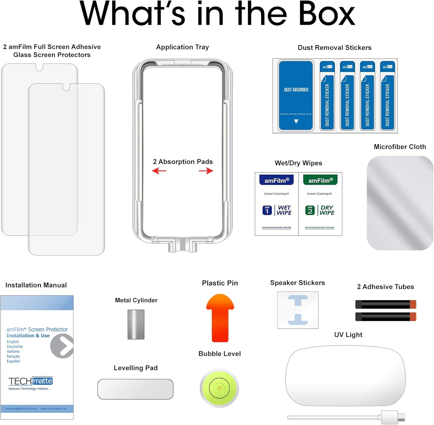 Includes: (2) Tempered Glass Screen Protectors, (1) Application Tray, (1) UV Light, (1) Wet/Dry Wipe, (1) Micro-Fiber Cleaning Cloth, (6) Dust Removal Stickers, (1) Sheet of Speaker Stickers, (1) Leveling Pad, (1) Metal Cylinder, (2) Absorption Pads, (2) Adhesive Tubes, (1) Plastic Pin, (1) Bubble Level, (1) Installation/User Guide
