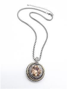 Brilliant Shimmer & Sparkle! Crafted with inset prong set center 5.00ct round cut faceted brown topaz CZ crystal surrounded by petite clear CZ crystals and outlined with 18kt gold plated outline & dots texture, this exquisite round pendant on thin 2.5mm silver box chain radiates refined sophisticated style & rich opulance with gorgeous detailing and craftmanship!
