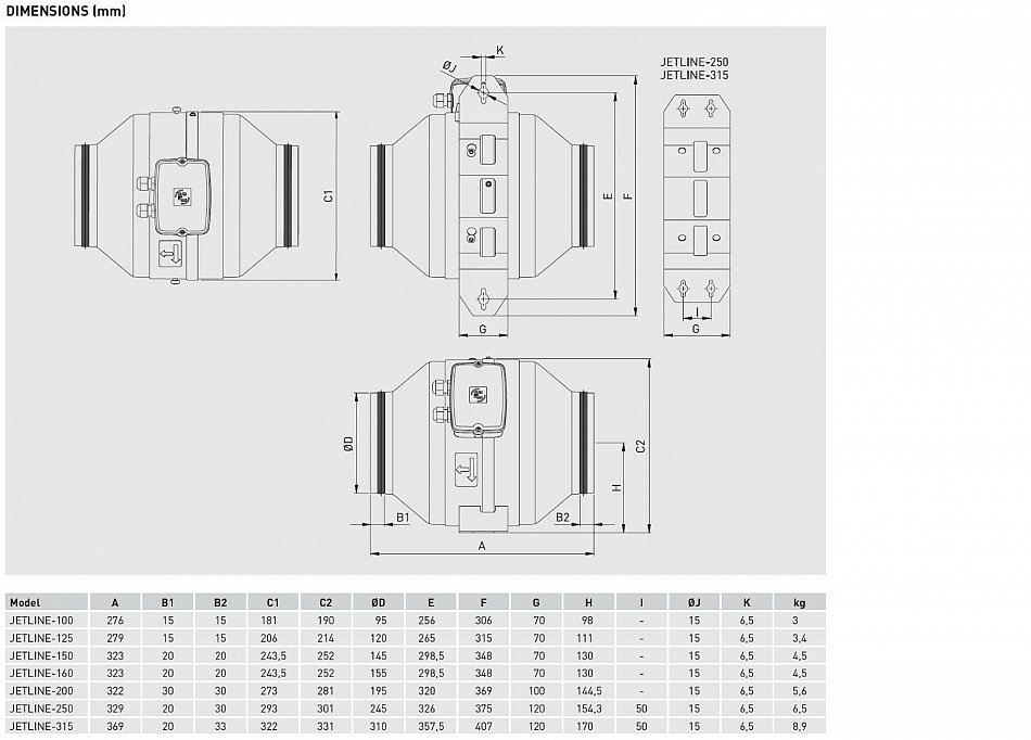 Rohrventilatoren, mit Volumenströmen von 260 bis 1.610 m³/h. Das neuartige radiale Laufrad sowie die aerodynamisch und akustisch optimierte Gestaltung der Ventilatoren, samt des von S&P entwickelten und patentierten SILENT-BLOCKS, garan-tieren hohe Volumenströme und einen geräuscharmen Lauf bei kompakten Abmessungen.Die Geräte können in jeder Achslage betrieben werden Gehäuse-Stahlblech, verzinkt- Komplett mit Montage-Konsole- Die Anschlussstutzen entsprechen den gängigen Rohrdurchmessern NW 100 bis NW 315, mit Gummilippendichtungen ausgestattet- Montage-Konsole und Klemmenkasten tragen nicht in der Höhe auf- Klemmenkasten IP65 Laufräder- Radiale Bauweise- Mit Leitschaufeln und Diffusor- Kunststoff - Spritzguss