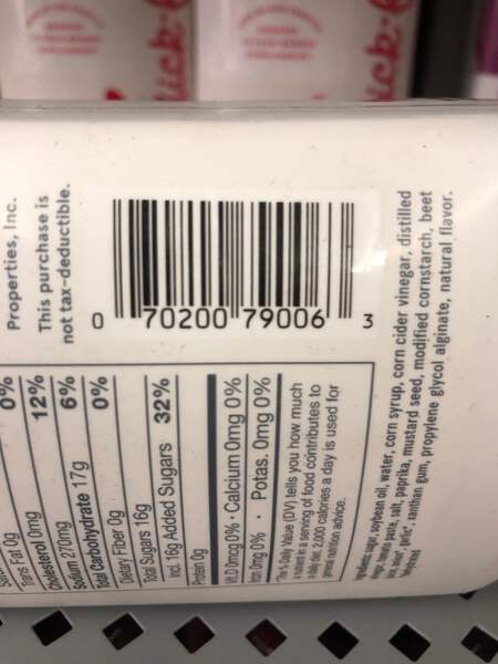 Ingredients: Sugar, Soybean Oil, Water, Corn Syrup, Corn Cider Vinegar, Distilled Vinegar, Tomato Paste, Salt, Paprika, Mustard Seed, Modified Cornstarch, Beet Juice, Onion*, Garlic*, Xanthan Gum, Propylene Glycol Alginate, Natural Flavor, *Dehydrated