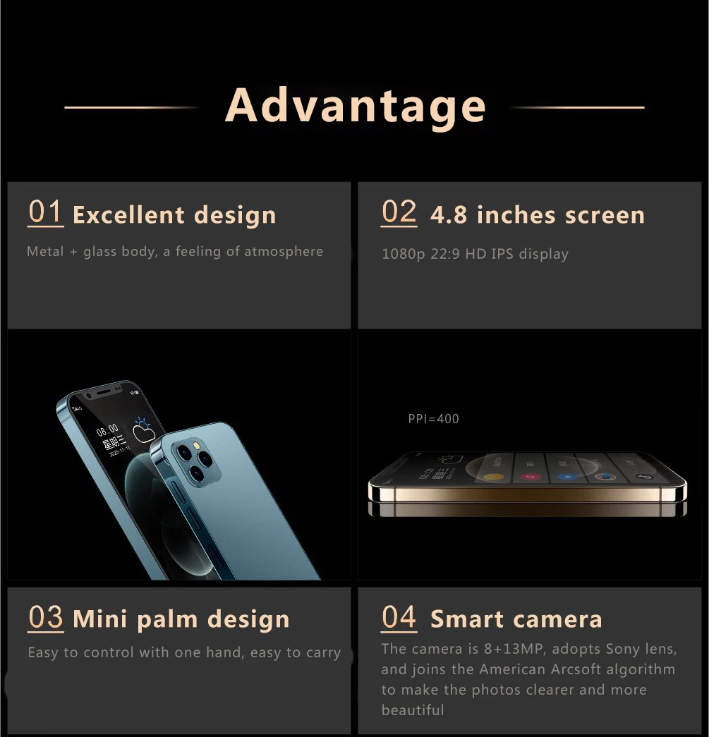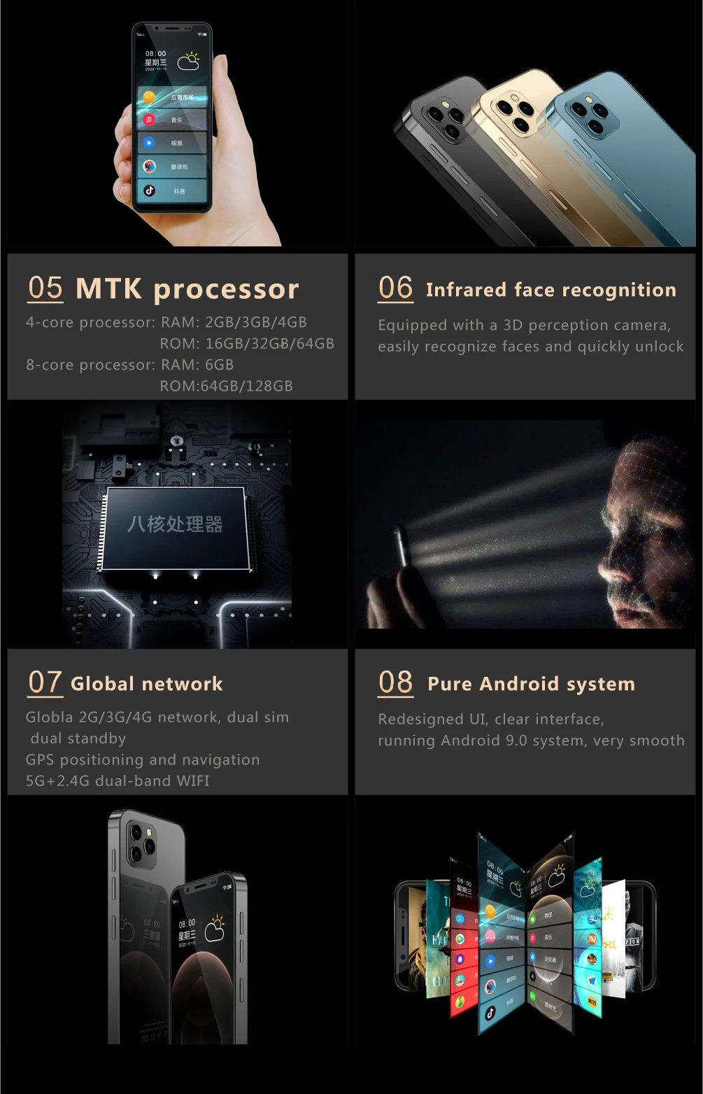Mini Android 9.0 SmartPhone Support GSM and WCDMA and LTE Dual SIM Dual Standby (1 Micro SIM cards + 1 Nano SIM or 1 Micro SIM + 1TF card) MT6757 Quad Core 4.8 inch high resolution screen Front 5MP + Rear 8MP camera Support Wifi,Bluetooth face ID etc.