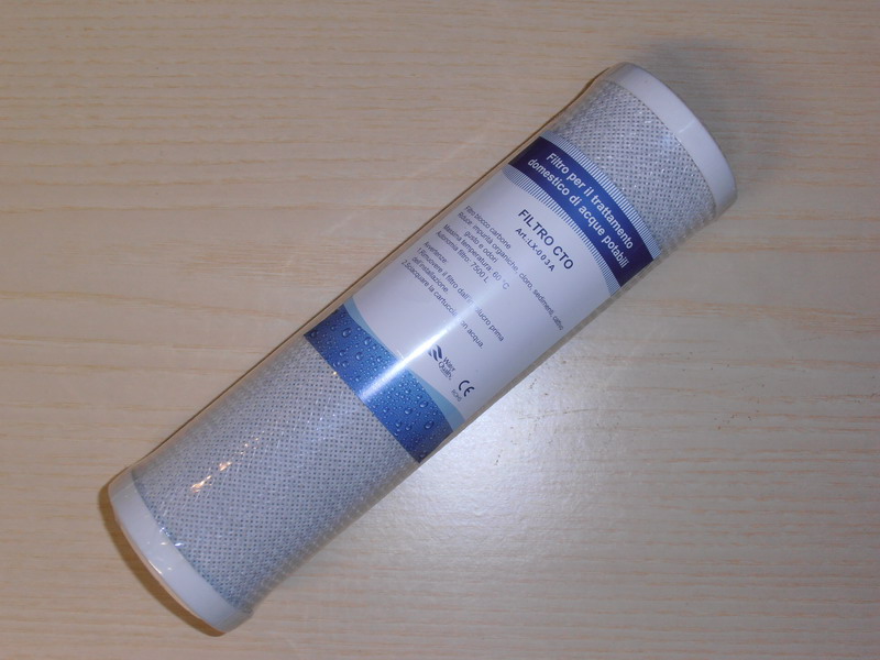 3° filtro: CTO cartuccia a carbone attivo (carbon block, per una maggiore efficienza rispetto al normale carbone attivo granulare), per rimuovere sostanze organiche, cloro e pesticidi.
