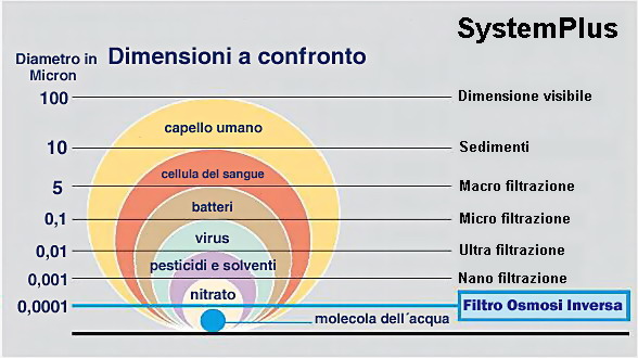 5° filtro: membrana da 150 GPD per rimuovere tutte le sostanze inorganiche come nitrati, metalli pesanti, minerali in eccesso, virus, batteri e radioattività.