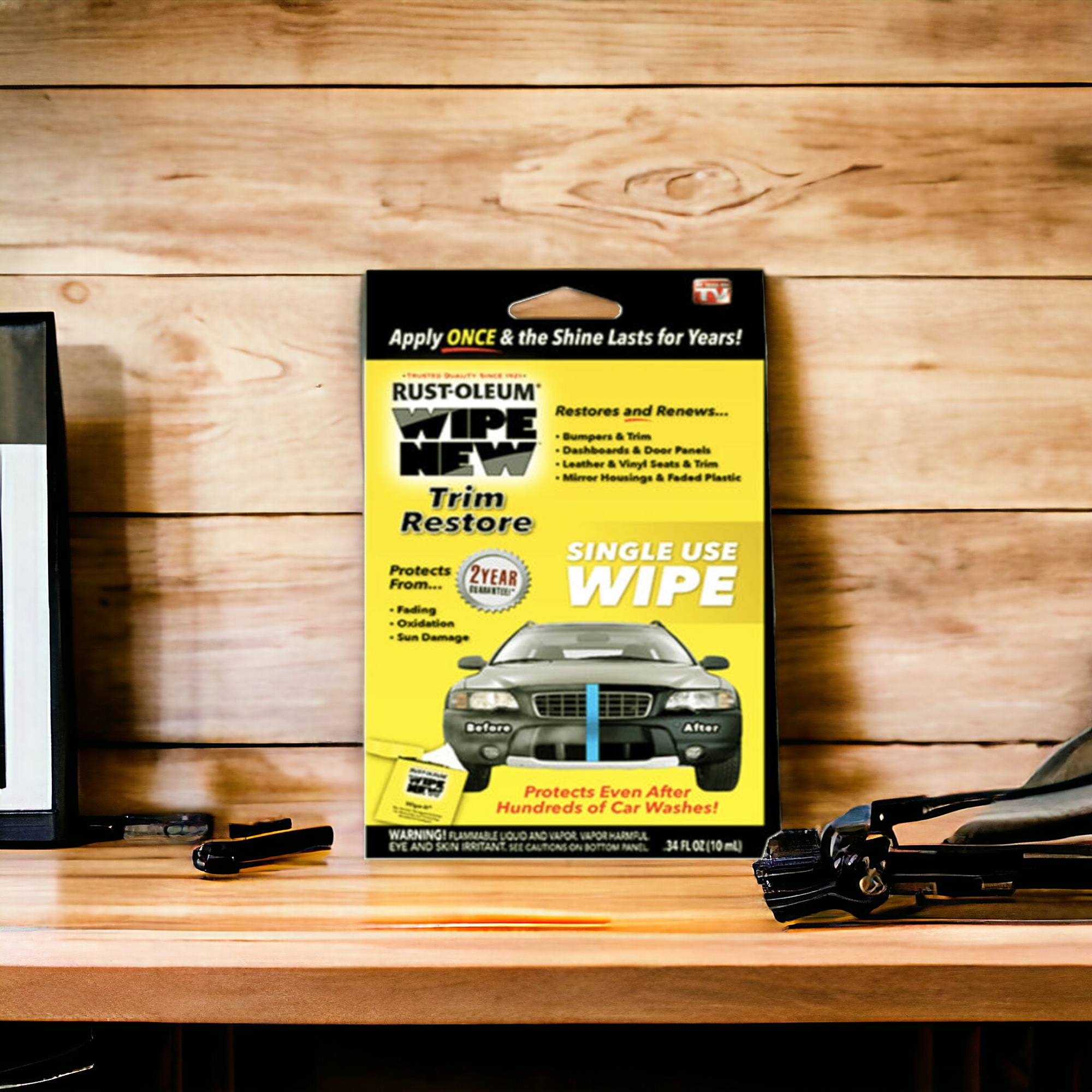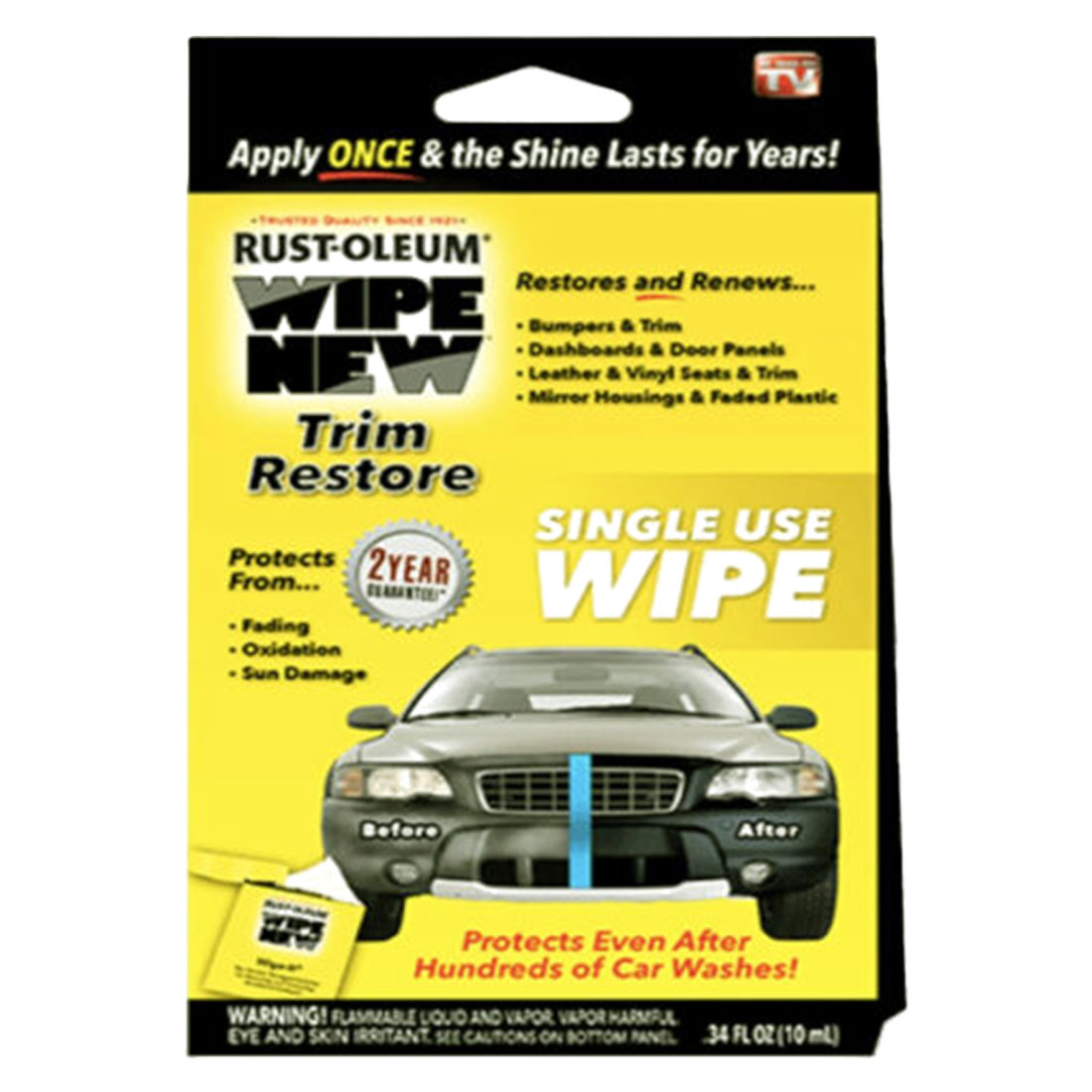 Wipe New Trim Restorer comes with a convenient wipe-on cloth applicator, providing a simple solution for restoring faded trim and plastic surfaces. With 0.34 fl. oz. of the effective formula, it revitalizes your vehicle's appearance while offering protection against UV damage.