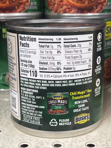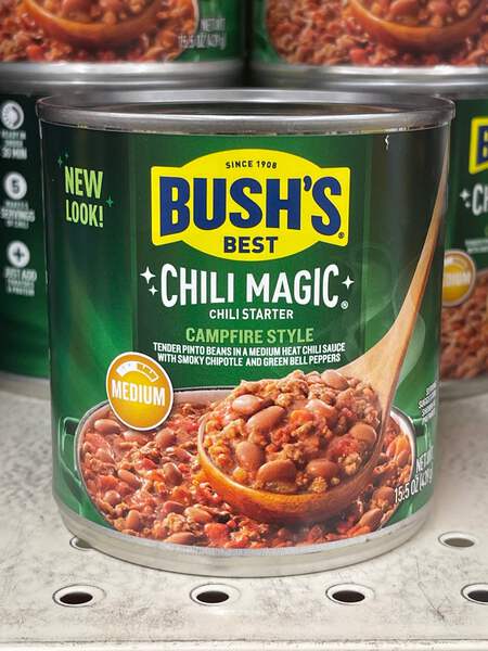4 Fresh Cans, shipped for FREE to your USPS address. Nothing beats the rich, hearty flavor of chili that's been cooking all day. The only downside? The "all day" part. For those looking for an easy way to make a “cooked all day” delicious pot of homemade chili, Bush's Chili Magic is the chili starter that helps you magically transform tomatoes and your favorite protein into a delicious pot of chili in under 30 minutes. Made with tender pinto beans simmered in a medium heat chili sauce with smoky chipotle and green bell peppers, Bush's Campfire Style Chili Magic Chili Starter helps you whip up delicious homemade chili m-m-magically easily. Bush's Chili Magic, Medium Chili Starter Campfire Style, 15.5 oz Canned chili starter - Campfire Style Made from tender pinto beans in a medium heat chili sauce with smoky chipotle and green bell peppers 6 grams of plant based protein (5% Daily Value protein) and 4 grams of fiber (16% Daily Value fiber) per serving Just add tomatoes, protein of your choice, and any other chili ingredients you wish Makes 5 servings of chili Ready in under 30 minutes Vegetarian, gluten free, cholesterol free, and low fat Packaged in recyclable cans Try Bush's Chili Magic Hearty Heat for a spicy Chili Starter Chicken Chili Recipe Taste the lighter side of chili when chicken and corn take center stage in this Chili Magic recipe. Ingredients: Oil 1/2 large onion, diced 1/2 green pepper, diced 1 lb boneless skinless chicken breast, cut into 3/8" pieces 1 can (28 oz) diced tomatoes Garlic powder Oregano 1 can (15.5 oz) Bush's Chili Magic Chili Starter, any style 1 cup frozen white corn kernels Shredded Cheddar cheese (optional) Directions: Saute the onion and green pepper in the oil until softened. Add chicken and saute until all chicken turns white. Add diced tomatoes, garlic powder, and oregano. Add Chili Magic and corn. Stir, cover, and simmer gently for 10 minutes. Serve garnished with Cheddar cheese (optional). Instructions Just add tomatoes, protein and veggies of your choice. Heat and serve. Ingredients Prepared Pinto Beans, Water, Tomato Paste, Salt, Contains less than 2% of: Spice, Onion Powder, Modified Corn Starch, Sugar, Garlic Powder, Green Bell Pepper, Lime Powder, Natural Flavor, Yeast Extract.