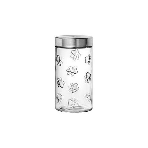 Amici Pet Maxwell Collection Paw Glass Storage Canister is the perfect canister to store your pet’s favorite treats. This large food safe glass storage canister is 56 ounces and features a textured paw print pattern on a clear glass body with a metallic screw top lid. The round shape and pattern design on clear glass give it a neutral appearance that allows it to fit well with most contemporary home decor styles. The glass part is dishwasher safe, and the lid should be hand washed.Product Specifics