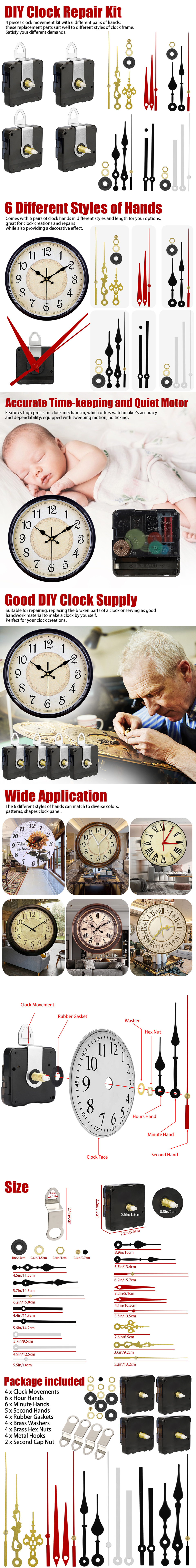 💯😍 DIY Clock Repair Kit:4 pieces clock movement kit with 6 different pairs of hands. these replacement parts suit well to different styles of clock frame. Satisfy your different demands.