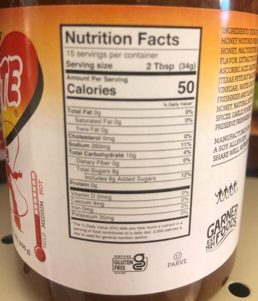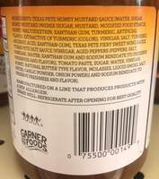 Ingredients: Ingredients: Texas Pete Honey Mustard Sauce [water, Sugar, Honey Mustard Premix (sugar, Mustard, Modified Food Starch, Honey, Maltodextrin, Xanthan Gum, Turmeric, Artificial Flavor, Extractive Of Turmeric[color}), Vinegar, Salt,turmeric, Ascorbic Acid, Xanthan Gum], Texas Pete Fiery Sweet®wing Sauce [texas Petehot Sauce (vinegar, Aged Peppers (peppers, Salt, Vinegar), Water, Xanthan Gum and Sodium Benzoate[to Preserve Freshness and Flavor]), Tomato Paste, Sugar, Water, Vinegar, Honey, Natural Butter Type Flavor, Molasses, Liquid Smoke, Salt, Spices, Garlic Powder, Onion Powder)]and Sodium Benzoate(to Preserve Freshness and Flavor).manufactured On A Line That Produces Products With A Soy Allergen.