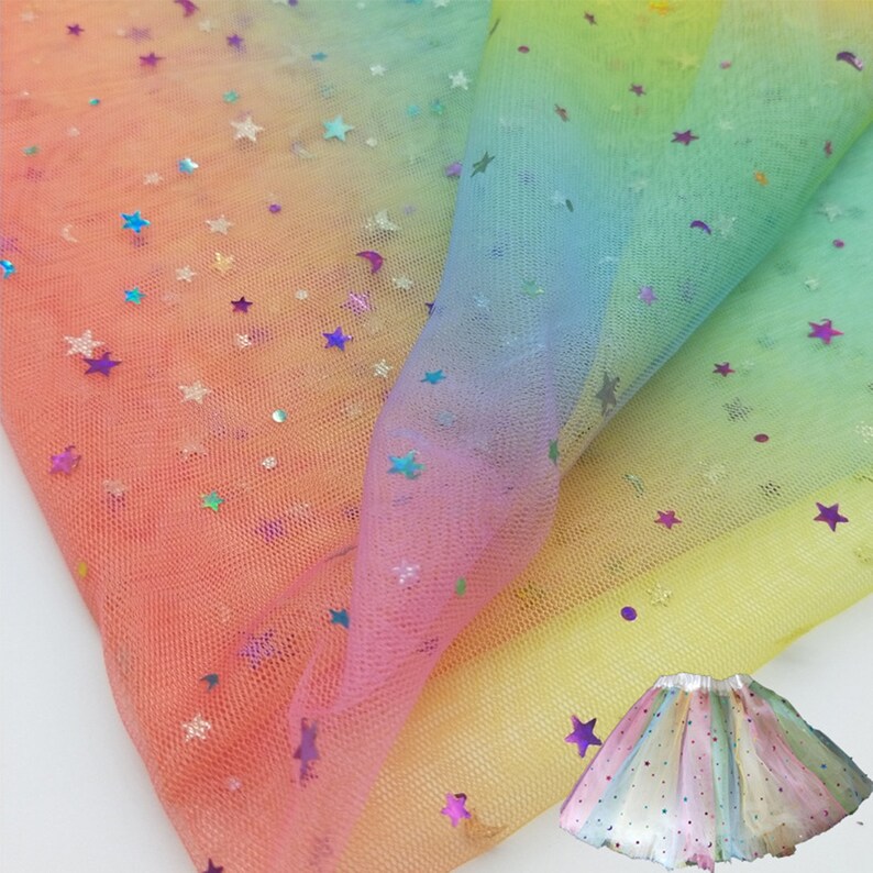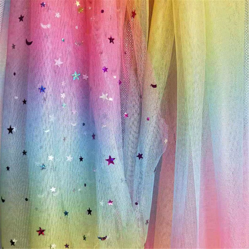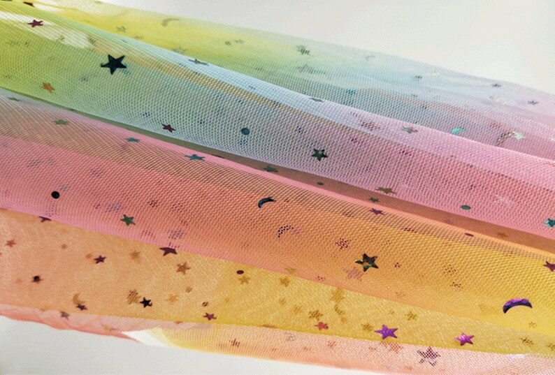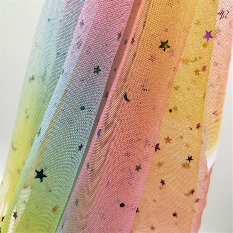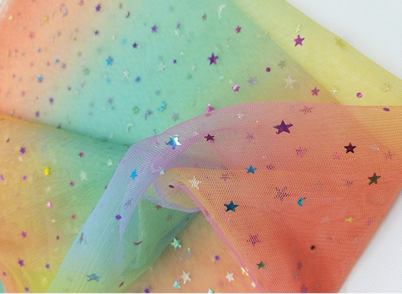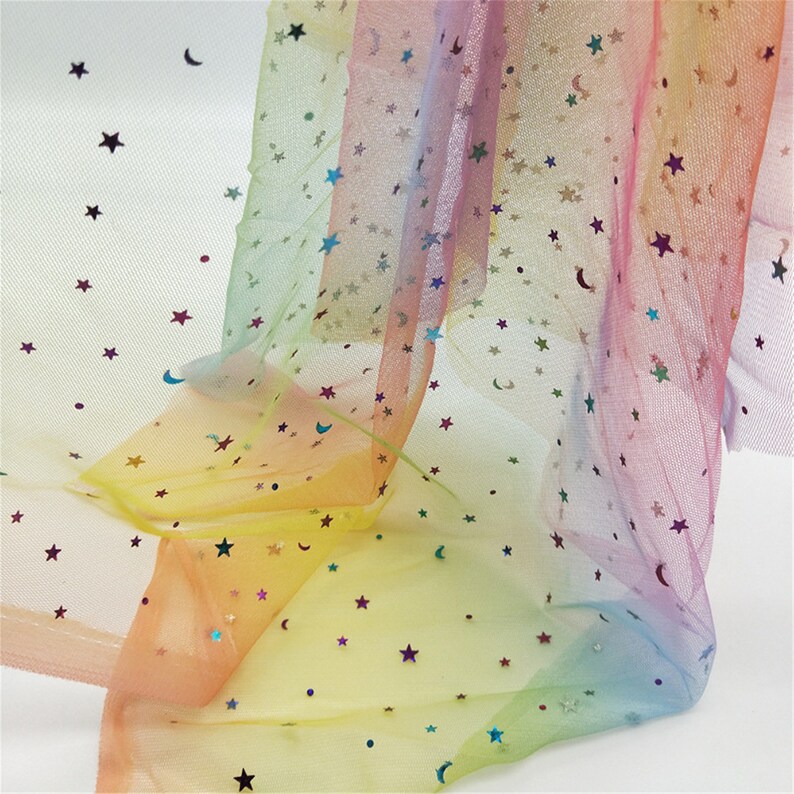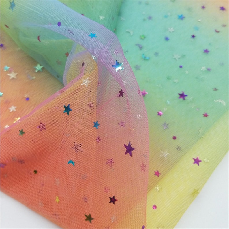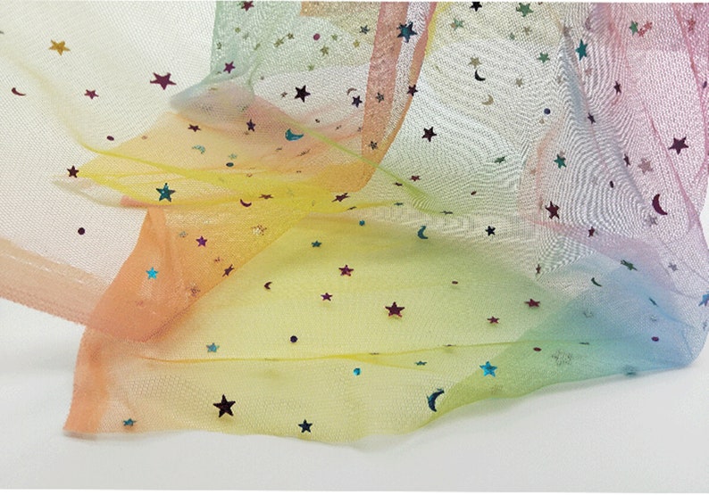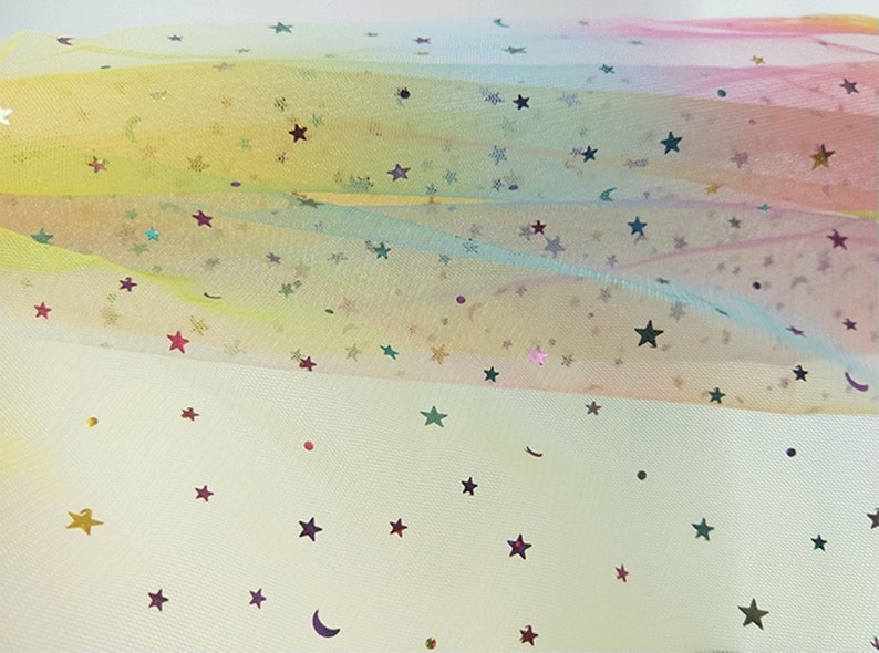 Beautiful colorful stars moons sequined ombre mesh lace fabric, it's ideal to tailor dreamy bridesmaid, bridal supplies, prom dresses, tutu skirt, wedding decor, costumes and birthday party background.