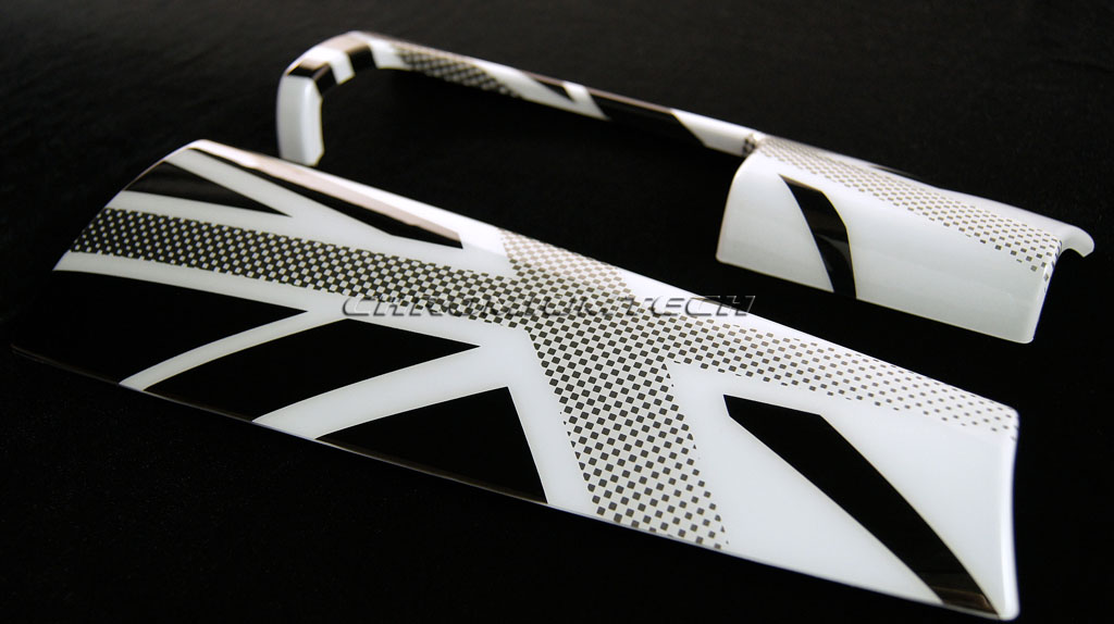 - 1 pair (one Driver Side + one Passenger Side) Gloss WHITE Union Jack Dashboard Panel Covers