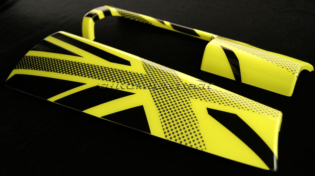 - 1 pair (one Driver Side + one Passenger Side) Gloss YELLOW Union Jack Dashboard Panel Covers