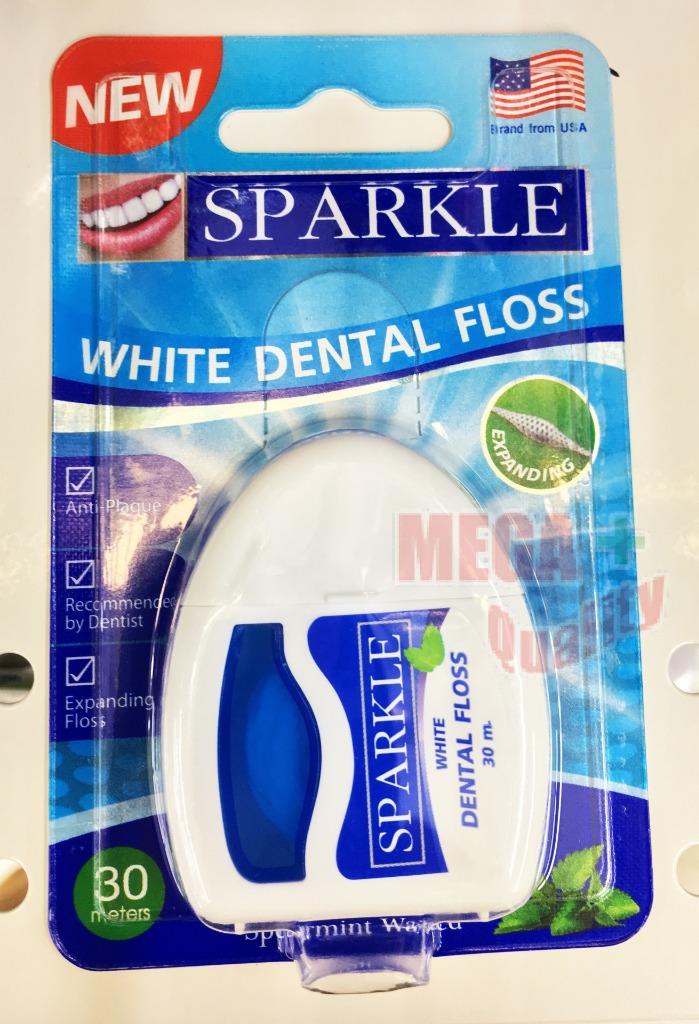 Decription : Sparkle White Dental Floss is a brand from USA and recommended by dentist. Its floss is expandable in order to promote an effective result in cleaning teeth and removing plaque. Wax is also coated on to increase its strength which the floss would not easily get broken. Spearmint also helps in freshening your breath. - Sparkle,dental floss teeth whitening. Spears mint scent length of 30 meters. - Silk can be expanded to fit the teeth clean between the teeth and gumline to effectively whiten teeth. - Silk wax coating for toughness, tear-resistant, not irritating. - Spears mint scent helps make sense, fresh breath. Be expanded to add texture to fit your teeth more effective in removing plaque and food particles. The sparkling white teeth. How to use : 1. Wind approximately 45cm of floss between the middle fingers of each hand. 2. Grasp the floss between your index finger and thumb, leaving approximately 1-2cm of floss exposed. 3. Gently slide the floss between each tooth using back and forth motions just to the gum line, then slide it up and down along the tooth surface to remove food debris and plaque.