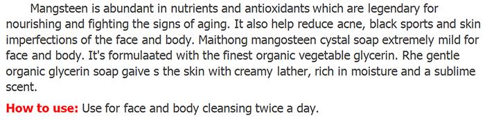 | | | Maithong Mangosteen Crystal Soap antioxidant nourishing Acne skin face body 70g. | Shipping Details: - The item will be shipped worldwide next business day after the money has been transferred to my Paypal account and you should received in 2-4 weeks. The item will be posted by airmail from Thailand in well package and send by Non-Registered airmail.