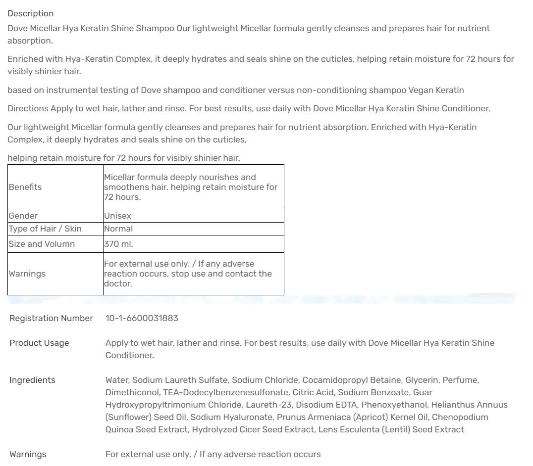 | Dove Micellar Shampoo Hya Keratin Shine Moisture For 72 Hours 370 ml. |