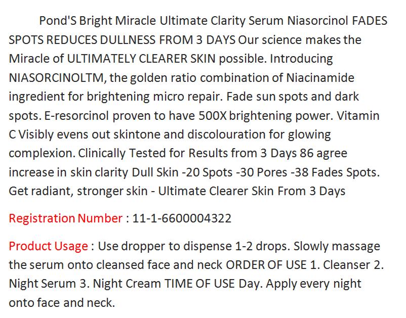 | | | Pond s Bright Miracle Ultimate Clarity Day Serum Niasorcinol Fades Spots 30g | Shipping Details: - The item will be shipped worldwide next business day after the money has been transferred to my Paypal account and you should received in 2-4 weeks. The item will be posted by airmail from Thailand in well package and send by Non-Registered airmail.