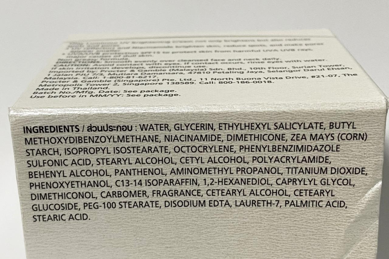 | Ingredients: Water, Glycerin, Ethylhexyl Salicylate, Butyl Methoxydibenzoylmethane, Niacinamide, Dimethicone, Zea Mays (Corn) Starch, Isopropyl Isostearate, Octocrylene, Phenylbenzimidazole Sulfonic Acid, Stearyl Alcohol, Cetyl Alcohol, Polyacrylamide, Behenyl Alcohol, Panthenol, Aminomethyl Propanol, Titanium Dioxide, Phenoxyethanol, C13-14 Isoparaffin, 1,2-Hexanediol, Caprylyl Glycol, Dimethiconol, Carbomer, Fragrance, Cetearyl Alcohol, Cetearyl Glucoside, PEG-100 Stearate, Disodium EDTA, Laureth-7, Palmitic Acid, Stearic Acid.