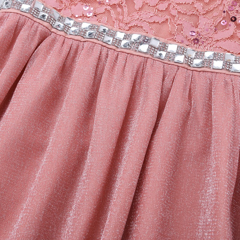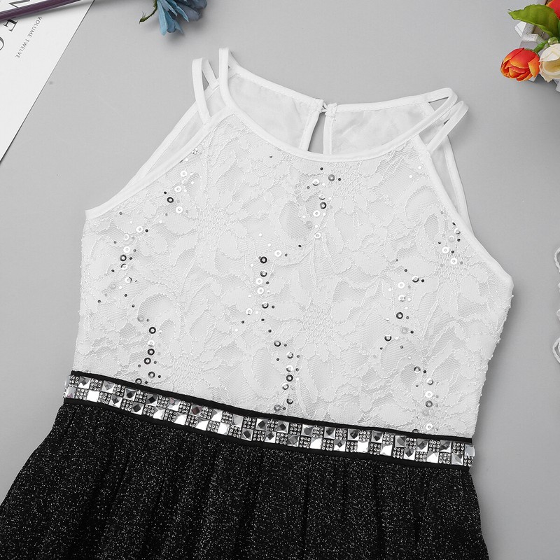 Sleeveless, round neck with clasp at back, sequined floral lace top bodice. High-waisted design adorned with rhinestone.