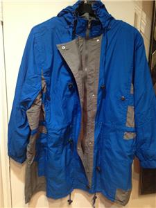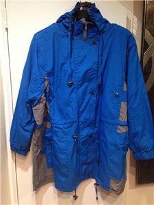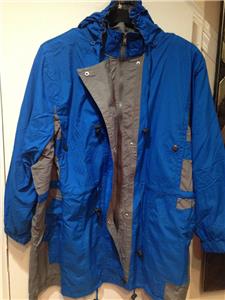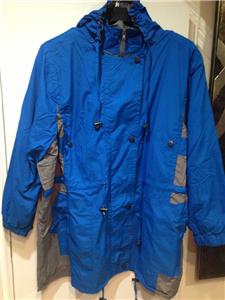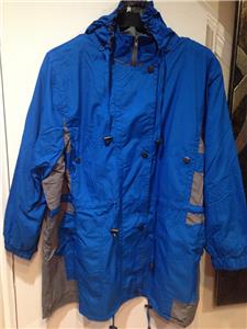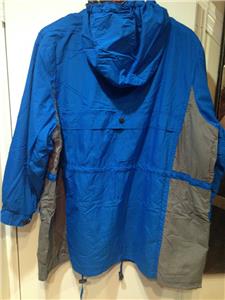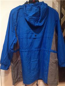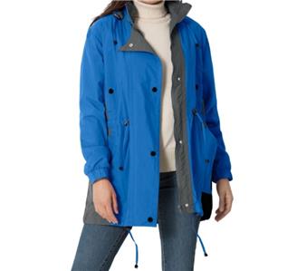 contrast, side panels, inside hood, inside placket, inside collar, front facing and back neck facing; four front pockets, two with snap closers, two with reinforced besom; back detail with button flap; hidden front zipper with wind-stopping snap flap