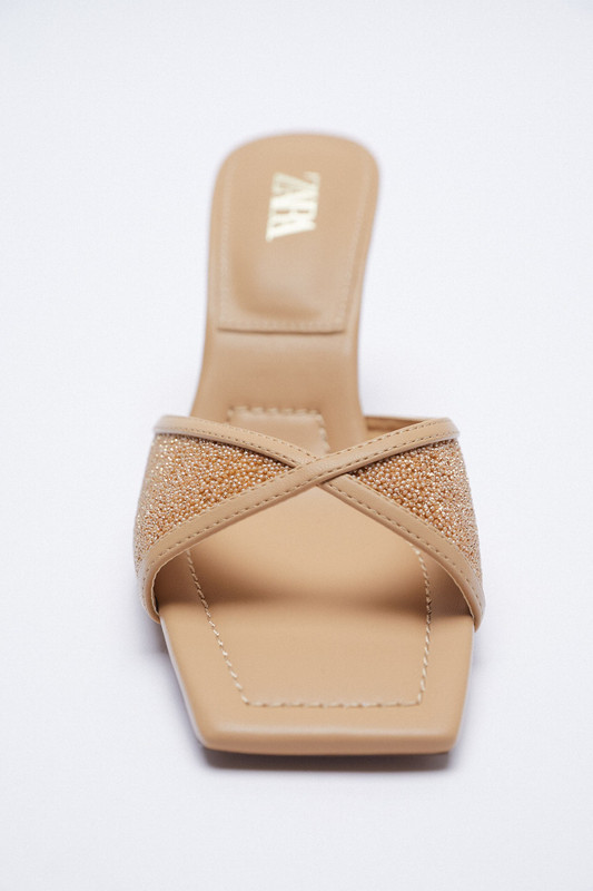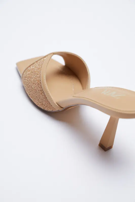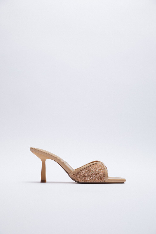 Description: Heeled sandals with sparkly detail. Squared toe.