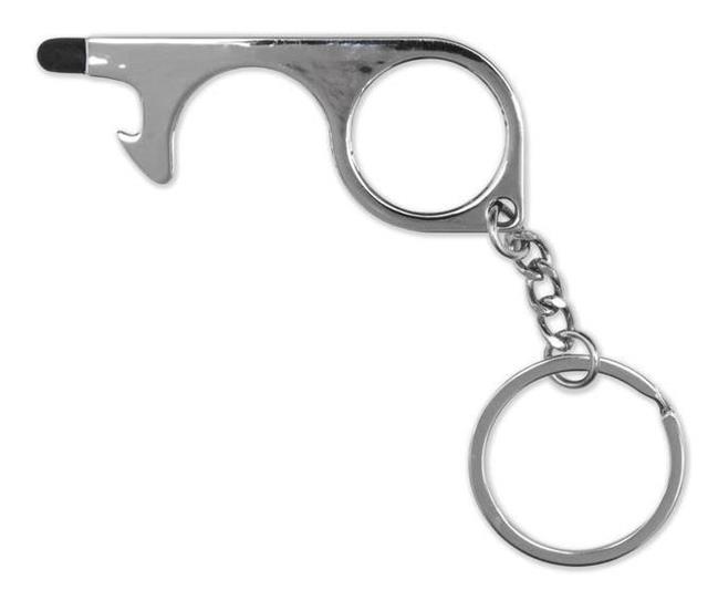 This Touchless Multi-Tool allows you to open doors, push pin pads, and use electronic devices contact free! This handy tool comes attached to a keychain for easy access. Made with antimicrobial silver plating it can easily be wiped down and sanitized.