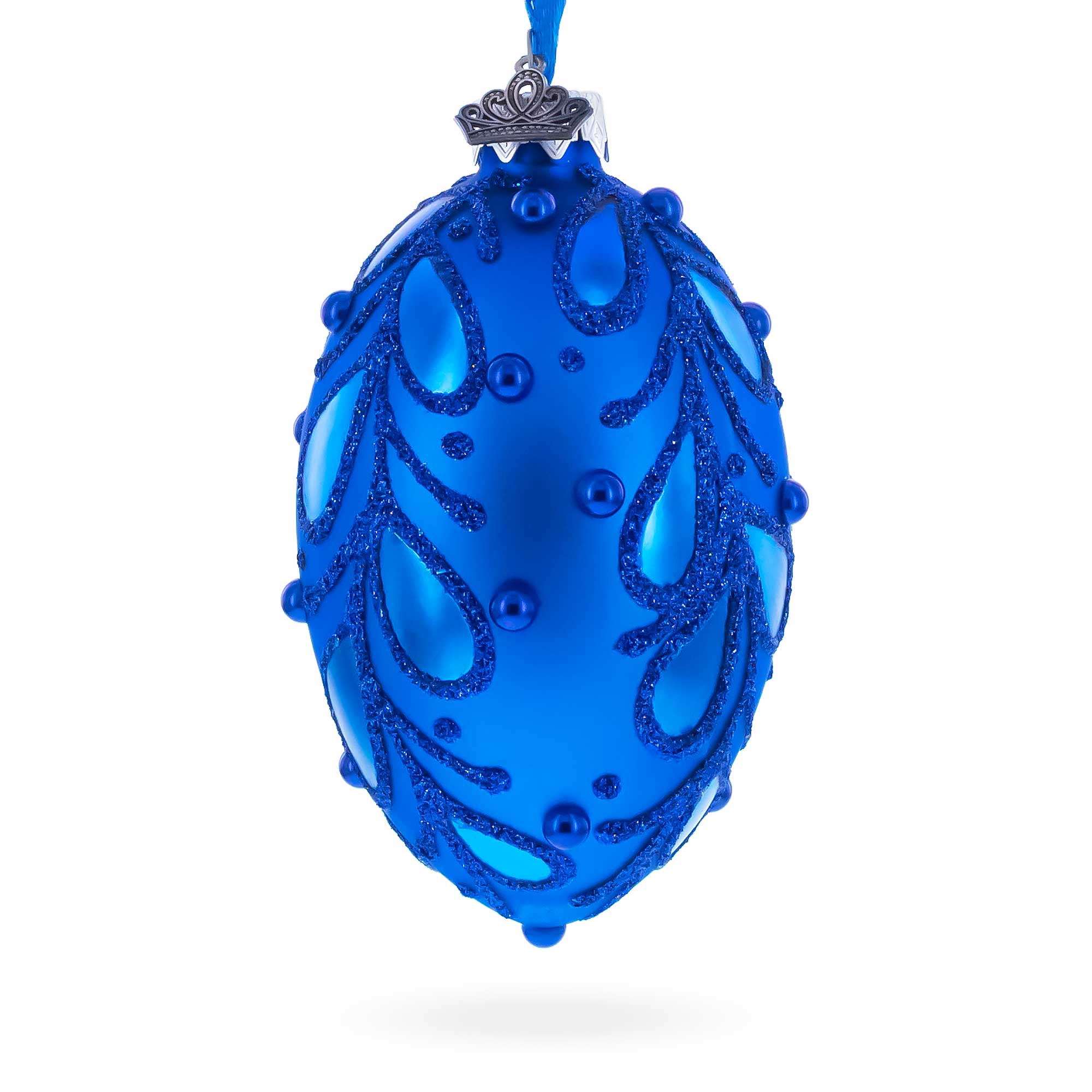 Bejeweled Scroll on Blue Glass Egg Christmas Ornament 4 Inches