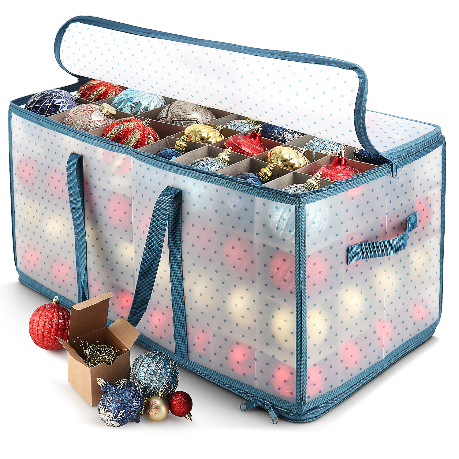 Adjustable & Easy-To-Remove Dividers - Adjustable strong dividers make it easy to make space for any size ornament you need. In addition, exclusive finger slots on the dividers make them a breeze to remove without the hassle other Christmas storage boxes give you. They easily hold minimum 128 balls.