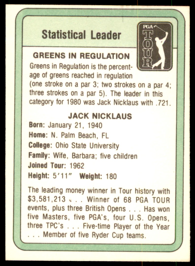 | Description: | Jack Nickulas b | | Category: | Golf | | Year: | 1981 | | Product: | Donruss | | Team: | Stat Leader | | Card Number: | 13 | | Dimensions: | 3½" x 2½" |
