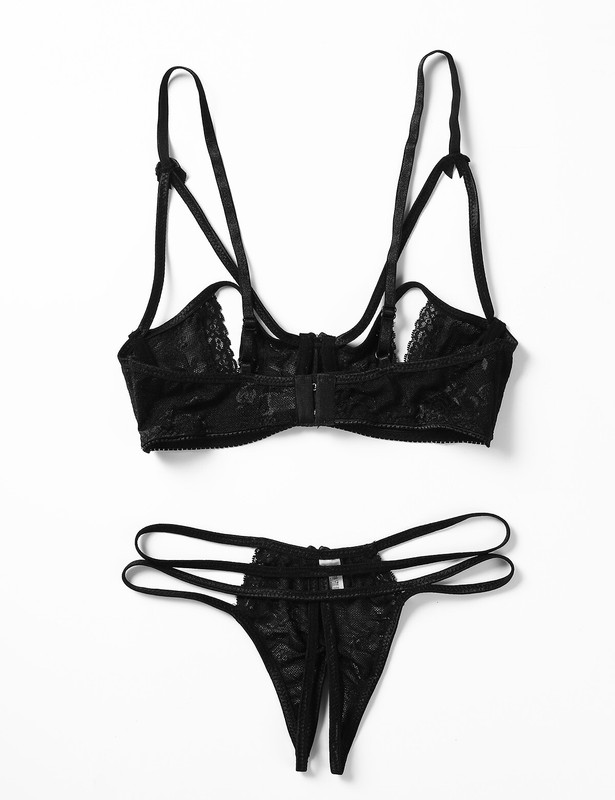 Exposed nipples design, scalloped trim underwired bra for a good support, elastic adjustable spaghetti shoulder straps and hook and eye closure for better fit.