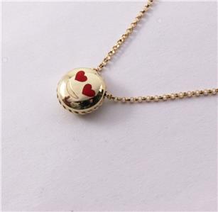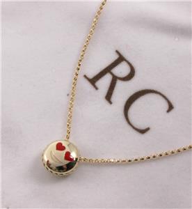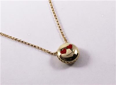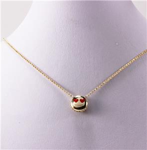 Authentic Roberto 18K yellow gold with red enamel falling in love heart emoji necklace pendant. Item total weight is approximately 4.1grams. The chain is 16.5/17.5 inches long adjustable. Pendant is approximately 0.41 in (10.4mm) in diameter (all measurements are from widest to widest. It is properly hallmarked including the hidden synthetic ruby as shown. Excellent new condition.