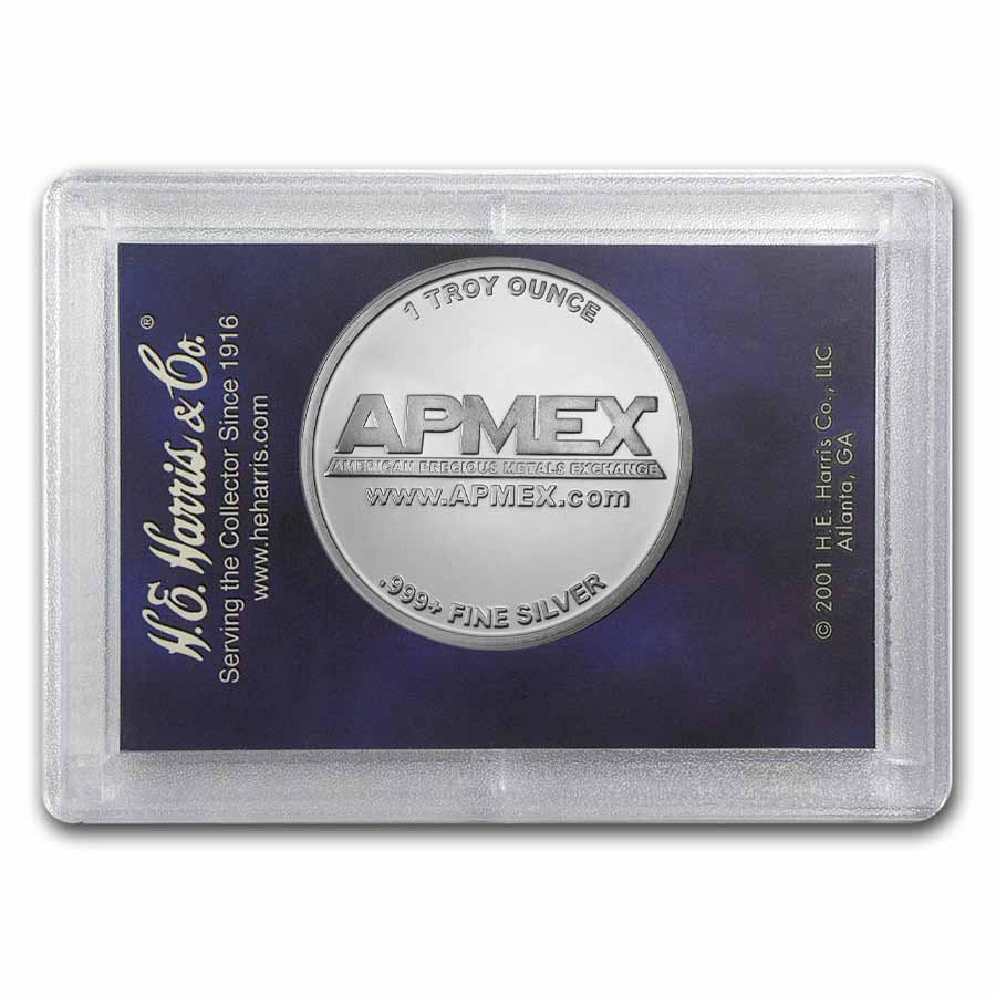 - Each 1 oz Silver round comes gift ready and housed in a Harris Holder case along with a blue and Gold cardboard insert.