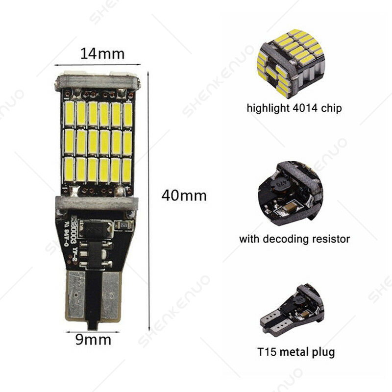 LED Reverse Backup Light Bulbs 912 921 T15 6000K Pure White Attention: For Honda Civic 2001-2012 & Accord 2003-2012, the reverse lights are two types, please check before buying: 1 for the coupe, the reverse light is 921, these LED lights T15 fit it 2. for the sedan, the correct reverse light is 7440. Features: Decoding. Energy conservation. Super bright. With constant current. Specifications: Light color: white Light source: 4014 Color temperature: 6000k-6500k LED Quantity: 45smd Power: 16W Voltage: DC 12V Irradiation angle: 360 degree Product size: approx. 5.25 x 1.8x 1.4 cm/2.06x0.7x0.55'' Note: Please allow 1-3mm differs due to manual measurement. Due to the different display and different light, the picture may not reflect the actual color of the item. Thanks for your understanding. Application: Cross Reference Bulb Size: 912, 921, T15, 904, 906, 916, 917, 920, 922, W16W, 2835 NOTICE: For some vehicles canbus still can't prevent error message. If you have any issues, we sincerely appreciate you contact us first. Package included: 2 x Car Reverse Lamp |