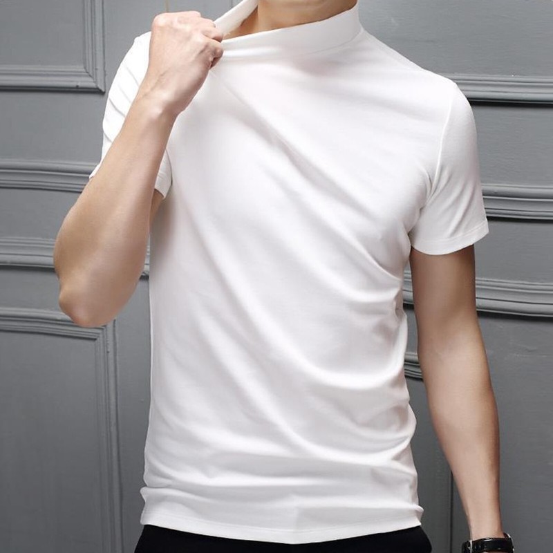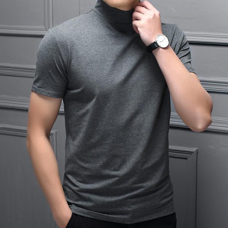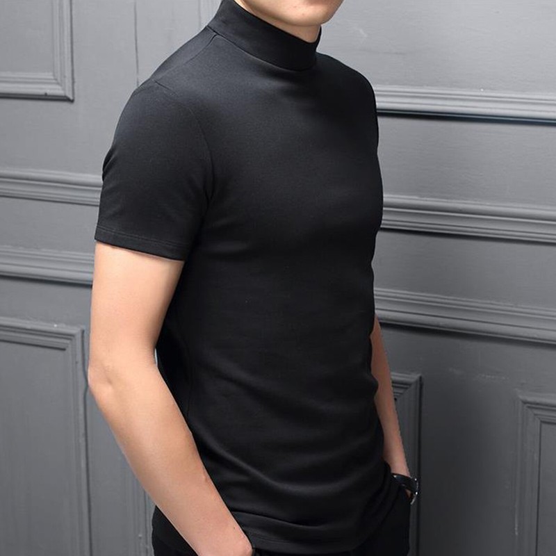Slim fit t-shirt, solid color, basic design, mock neck, short sleeve, fashion and casual.
