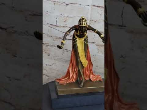 Crafted using the ancient "Lost Wax Method," this sculpture not only preserves the princess's physical form but also immortalizes her traditional dance. The rich brown and gold patina adds depth and warmth to the piece, enhancing its regal charm. Mounted on a sleek black beveled marble base with a multi-color patina and bearing the artist's signature, Colinet, this sculpture is a true masterpiece that brings the elegance and allure of ancient Egypt to life in your space. It's a perfect addition for art connoisseurs and enthusiasts alike, offering a glimpse into the timeless beauty of Egyptian culture.
