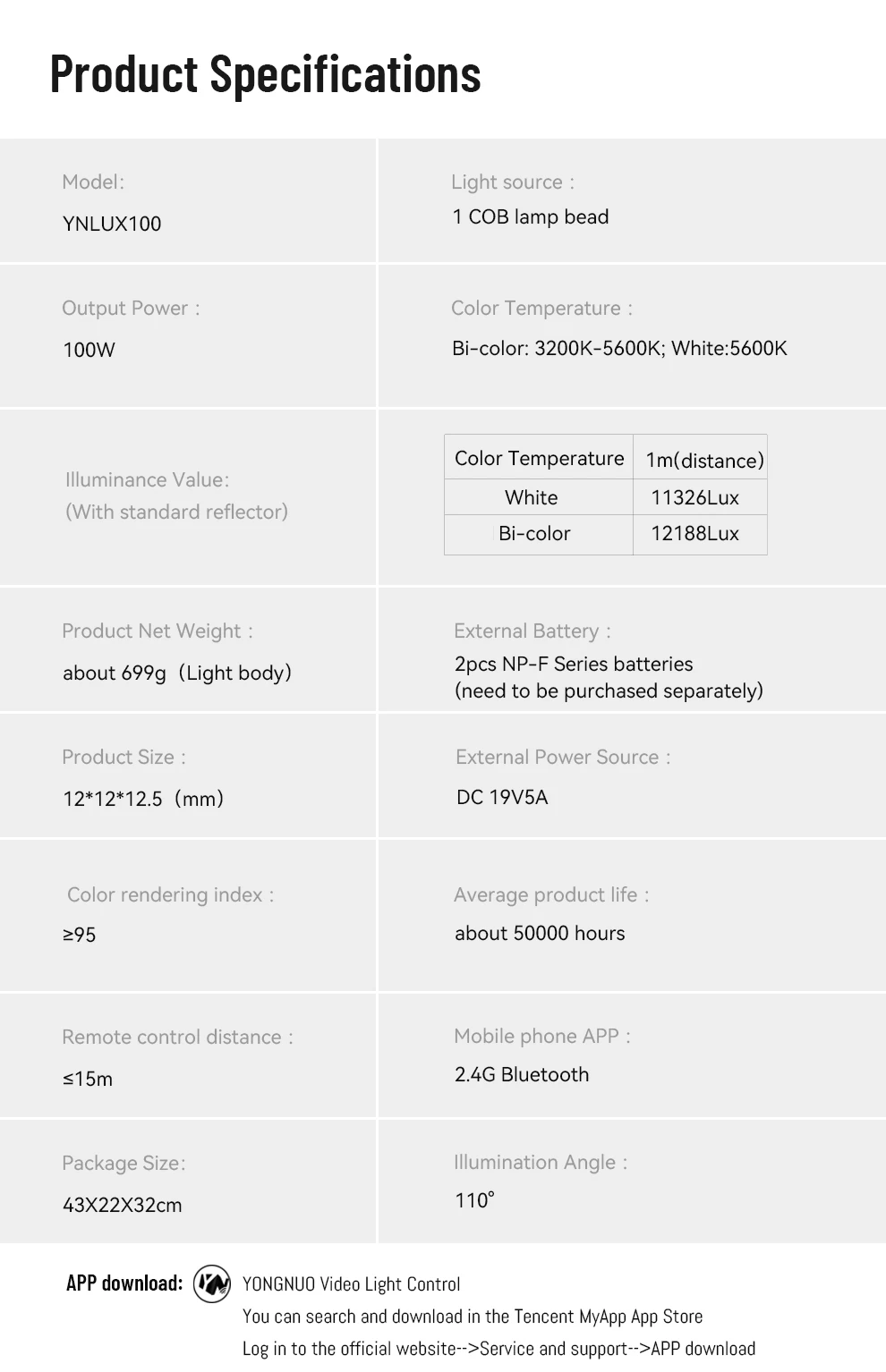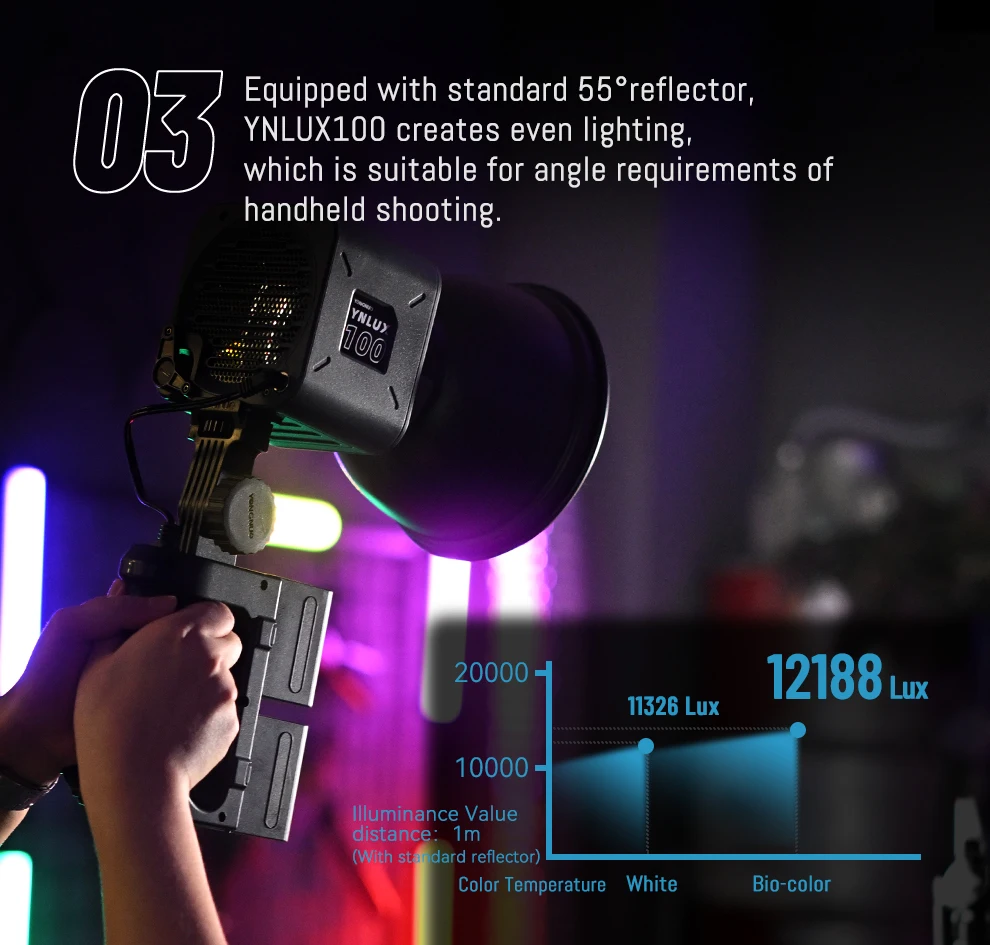Equipped with standard 55°reflector, YNLUX100 creates even lighting, which is suitable for angle requirements of handheld shooting.