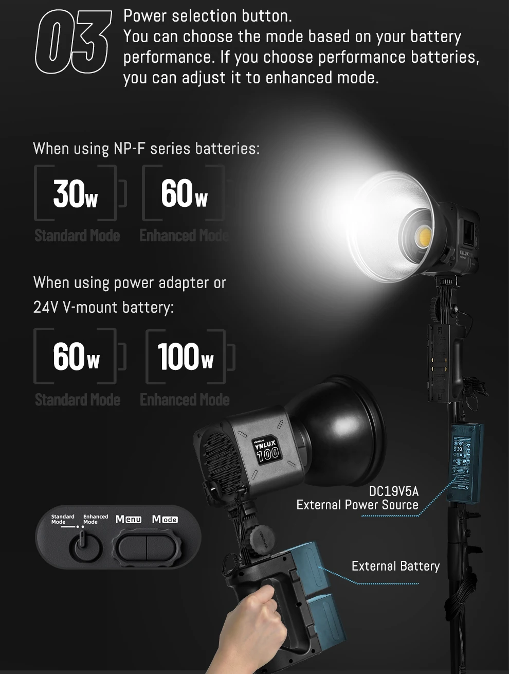 Note: 30W in Standard mode; 60W in Enhanced mode ; 100W with 24V V-mount battery . For more details, please refer to the user manual.