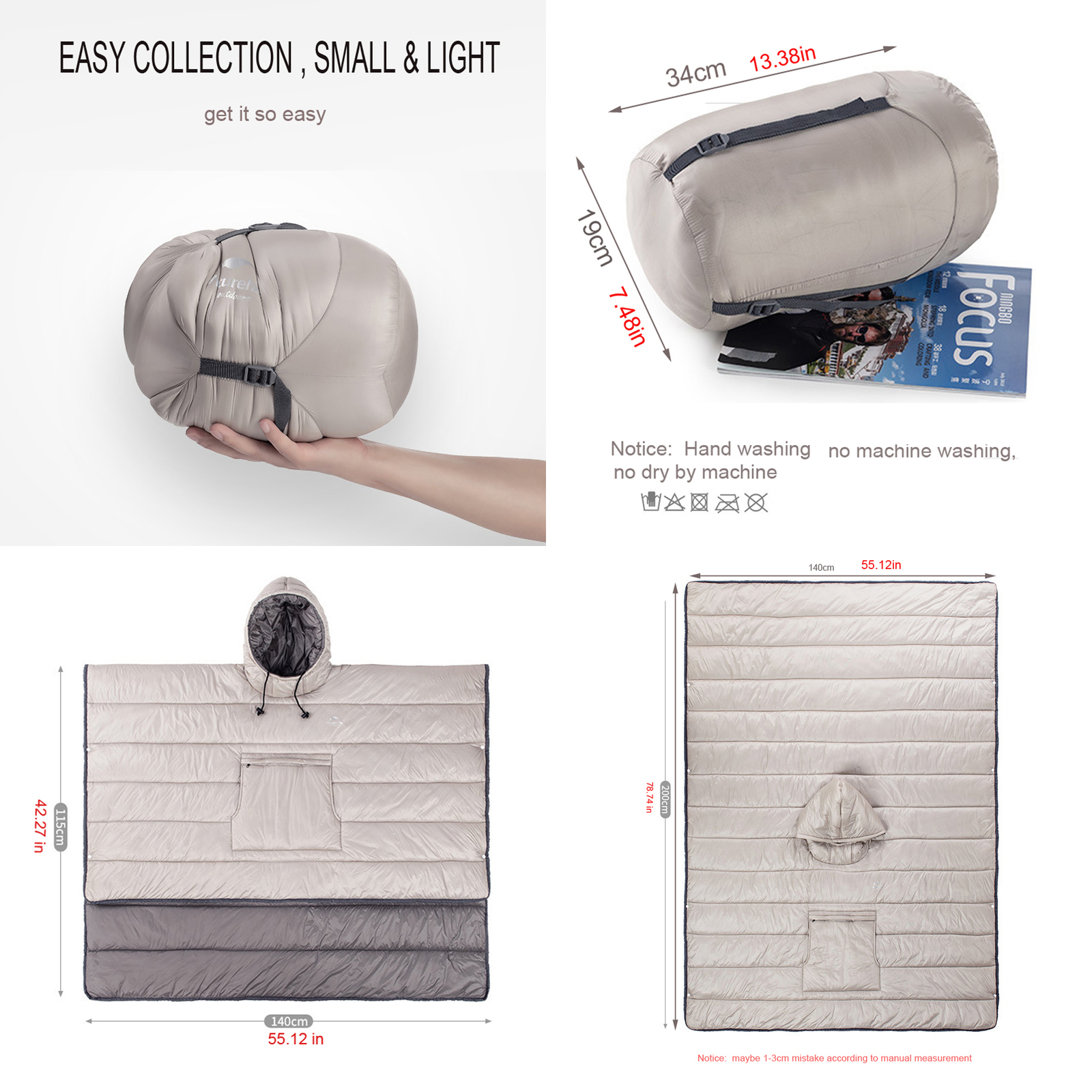 ➥Multifunctional:The small quilt can be used as wearing cloak,it can also be used as a small quilt in tent.Or insulated poncho,ground cover,sleeping bag, pillow,hammock liner,under quilt,and shade canopy.