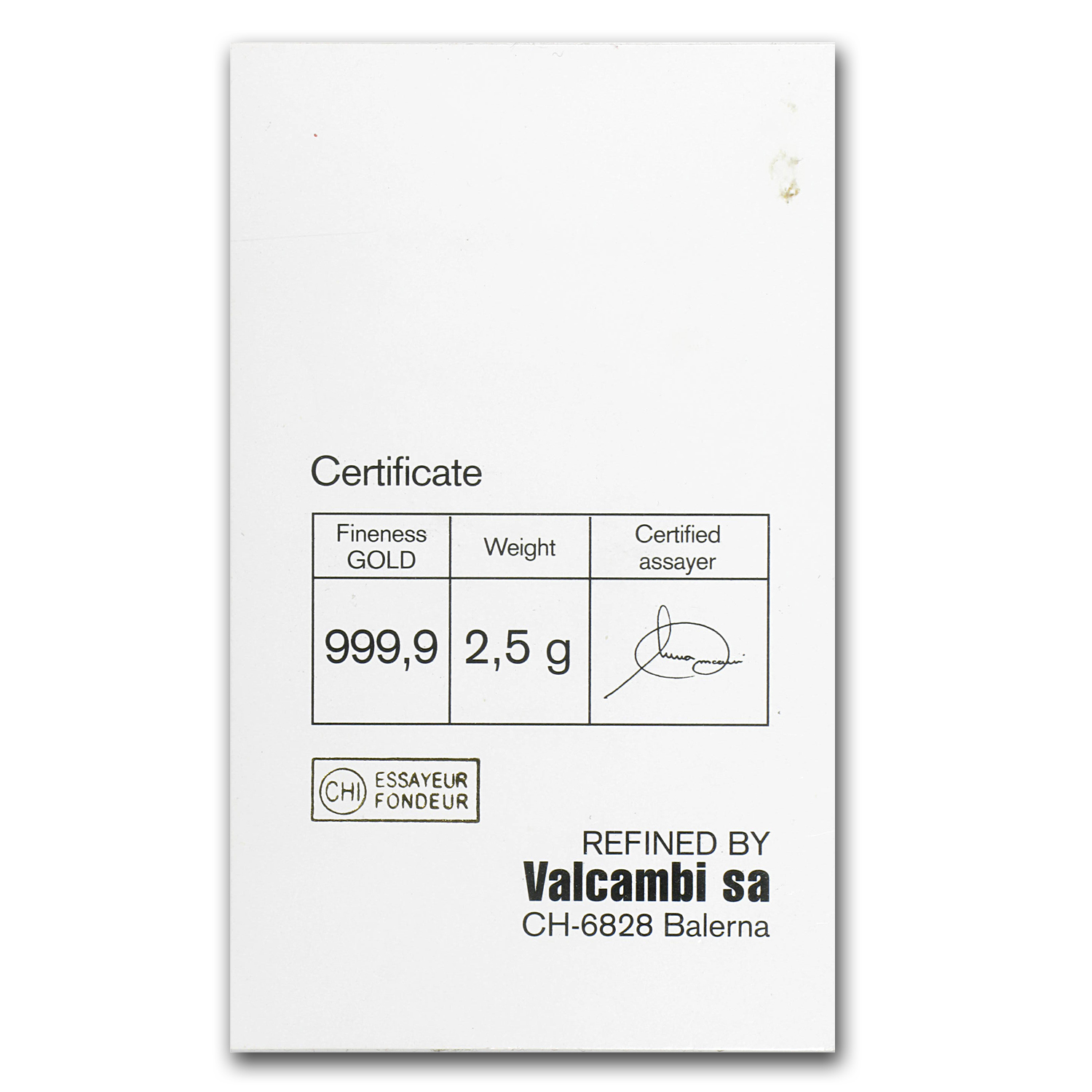 • The accompanying assay card lists the weight and authentication of the bar by the assayer.