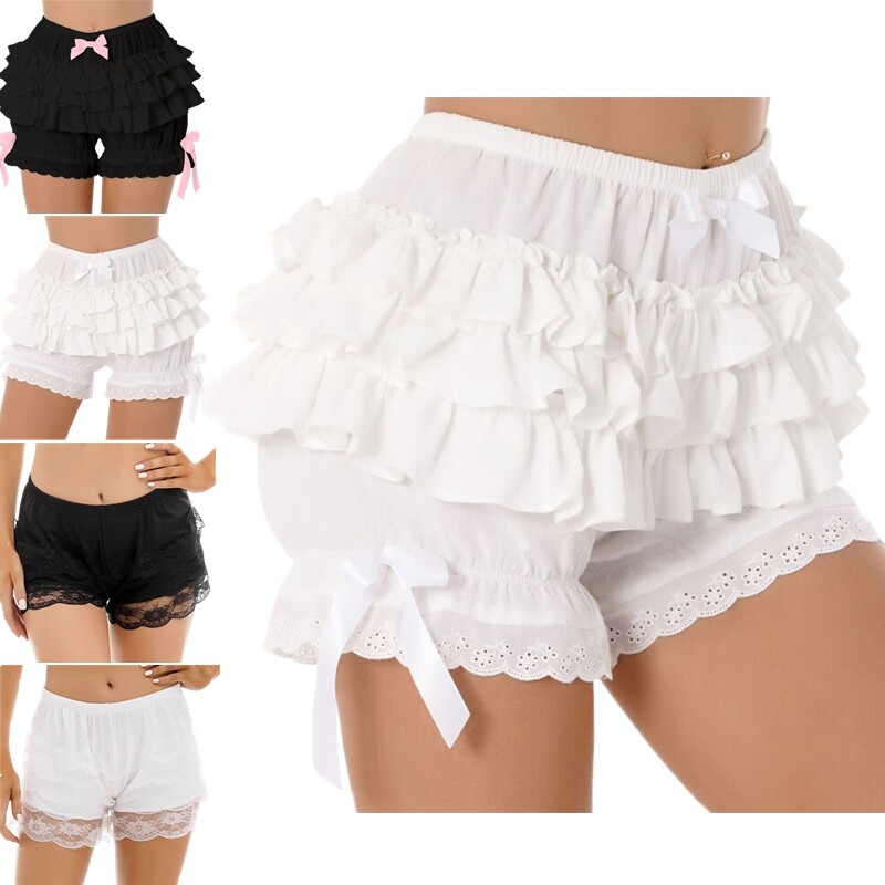 Women Lace Trim Layered Ruffle Bloomers Bowknot Frilly Panties Solid Color Shorts.