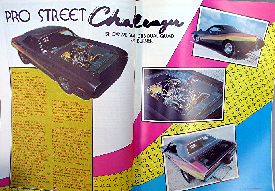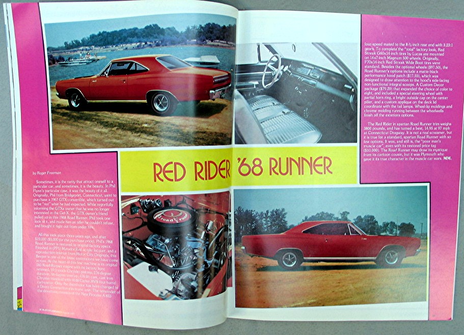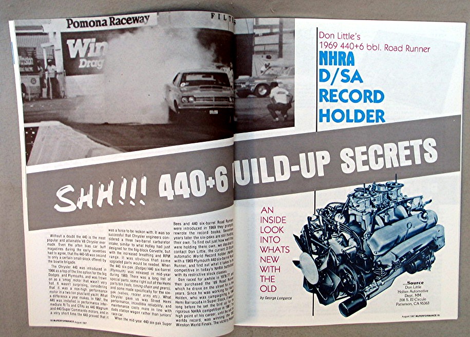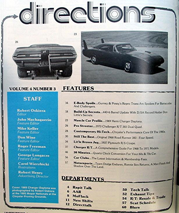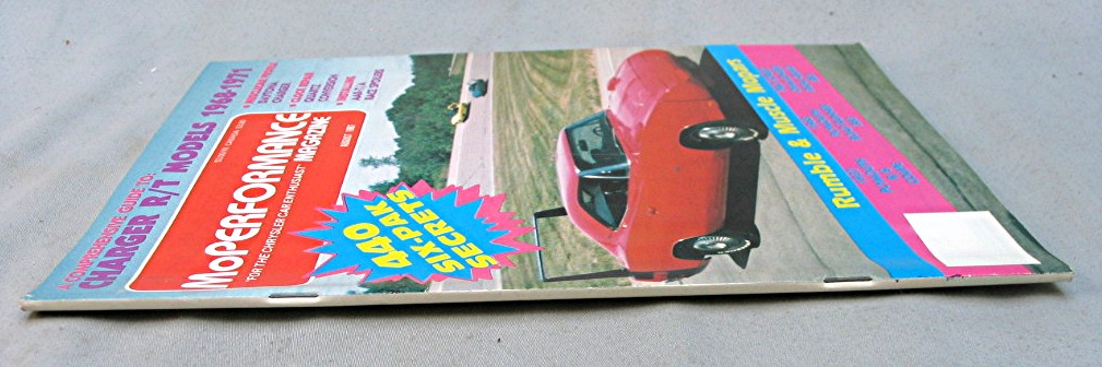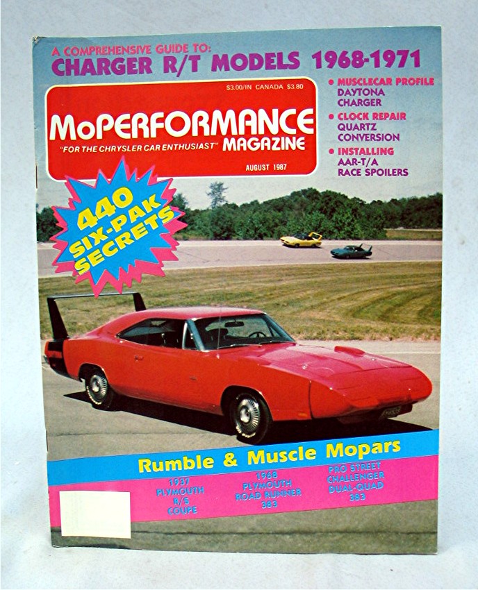 Magazine MoPerformance August 1987... Cover has colorful picture of a red Chrysler sports car, and reads, "A Comprehensive Guide To: Charger R/T Models 1968 - 1971 -- Musclecar Profile Daytona Charger - Clock Repair Quartz Conversion - Installing AAR-T/A Race Spoilers -- 440 Six-Pal Secrets -- Rumple & Muscle Mopars - 1937 Plymouth R/S Coupe - 1968 Plymouth Road Runner 383 - Pro Street Challenger Dual-Quad 383"... Magazine is in good condition, has about 58 pages of articles, advertisements and pictures... Magazine measures about 8 1/4" x 10 3/4"...