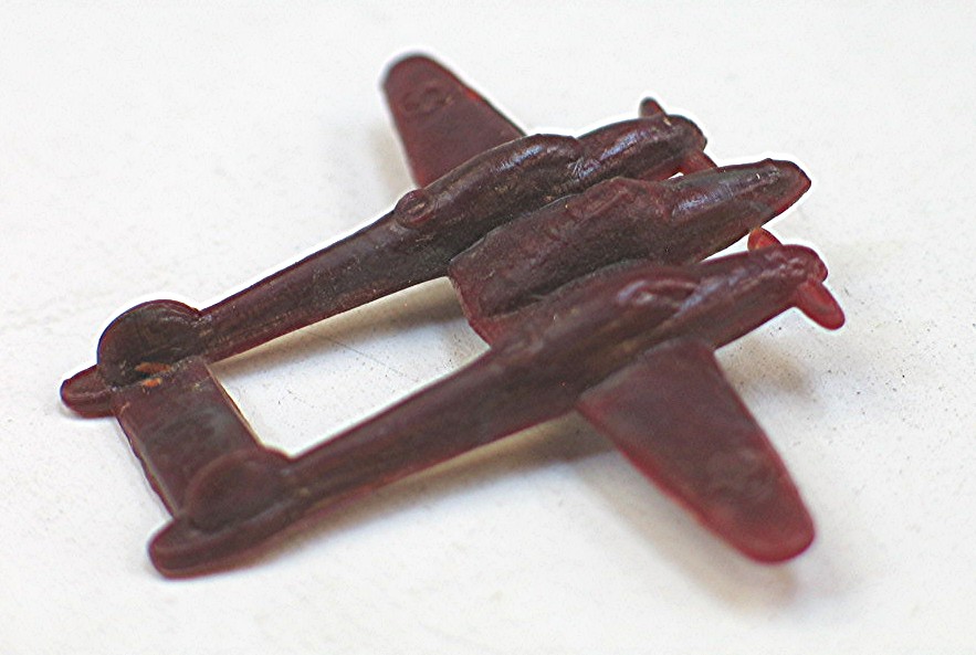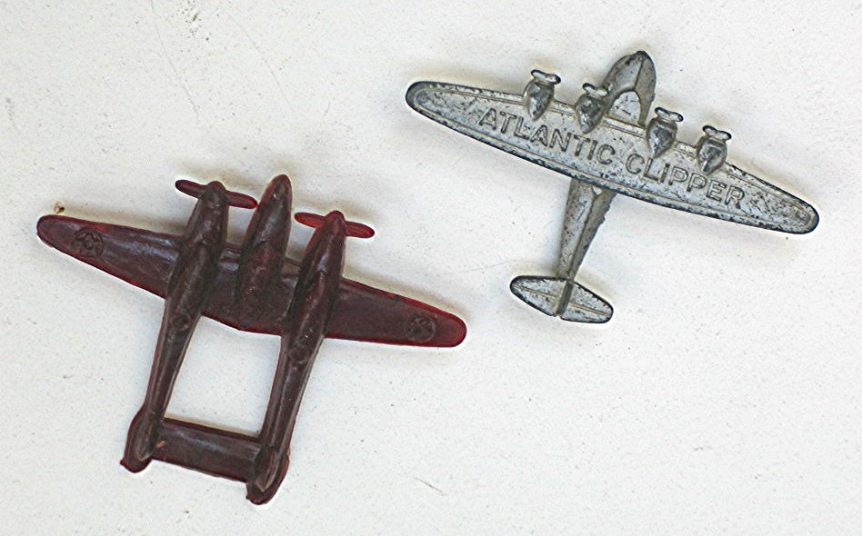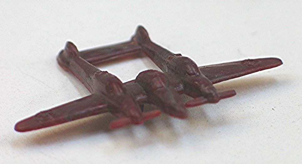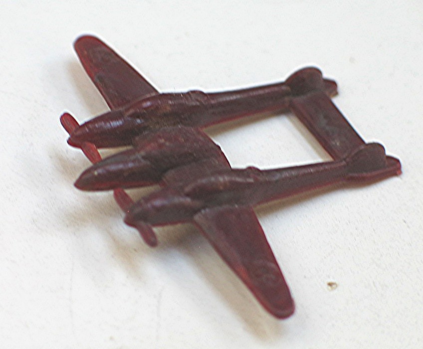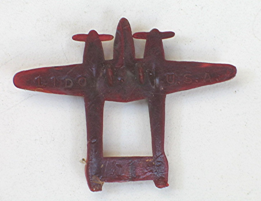 Vintage Plastic Toy Airplane P-38... Reddish brown plastic toy airplane, with stars in circle on the wings... Bottom of the plane reads, "Lido - U.S.A."... Toy airplane is in good condition, and measures about 1 3/4" long and 2 1/4" across the wing span... Last photo shown with a Tootsie Toy Atlantic Clipper for size comparison only...