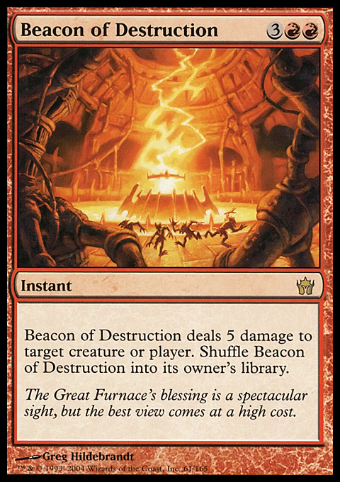 | | Name: | Beacon of Destruction | | Set: | Fifth Dawn | | Number: | 61 | | Condition: | Light Play | | Language: | English | | Variation: | Non-Foil | |